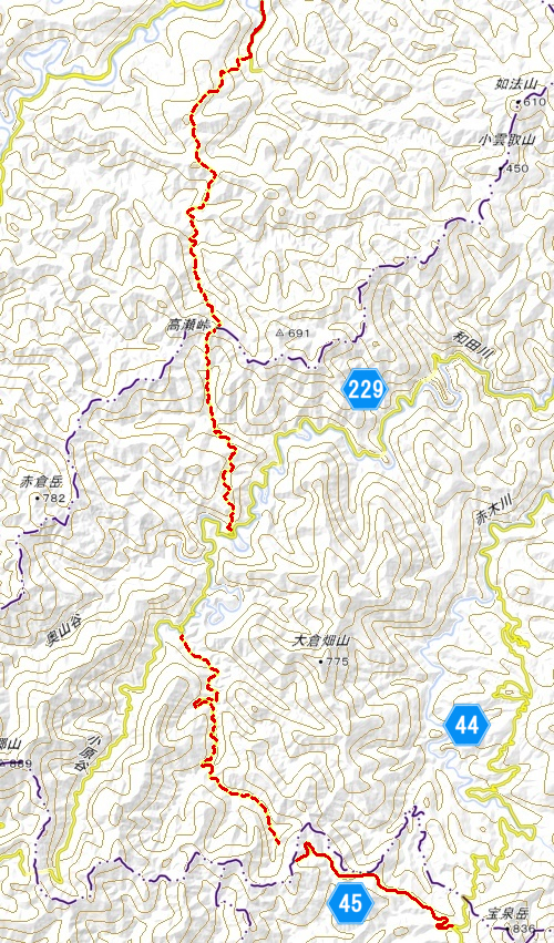 分断後、徒歩道となって復活しますが、県道45号那智勝浦本宮線らしき道は、 和歌山県道229号古座川熊野川線を越えてもなお徒歩道のままで、 高瀬峠を経て、本宮町皆瀬川でやっと車道が復活し、終点の本宮町請川に至ります。 |