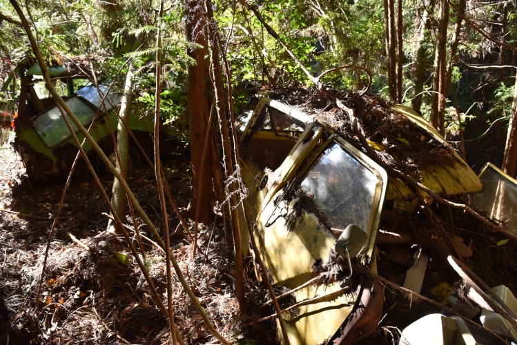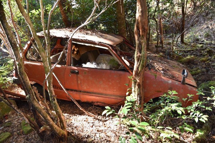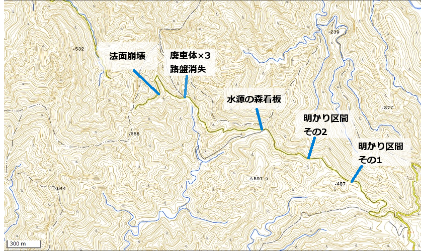 水源の森看板(0.7km地点)から標高を稼ぎ、峠(1.0km地点)を越えて路盤消失区間with廃車体(1.7km地点)まで下ってきましたが、 ここでまた登りに転じました。 |