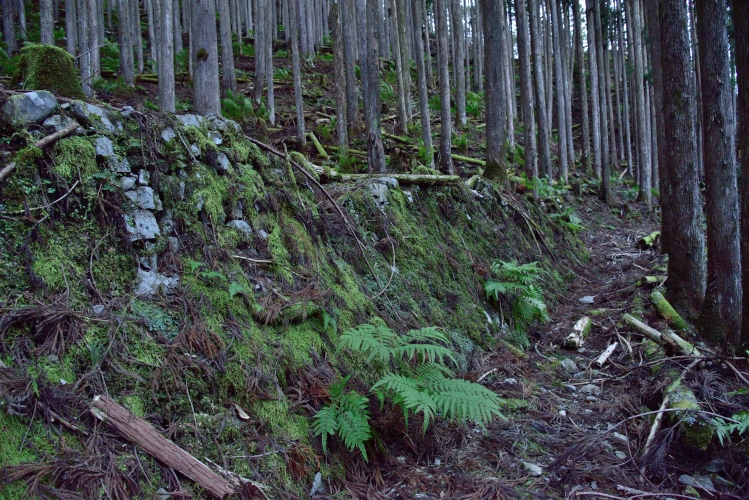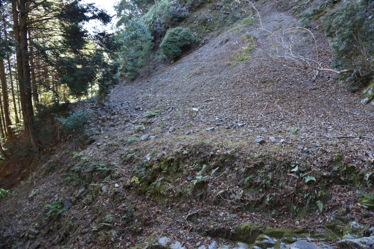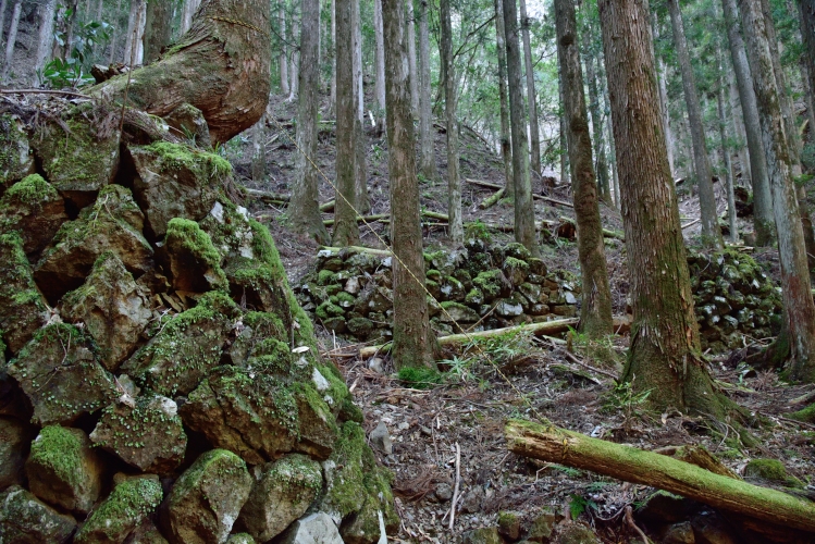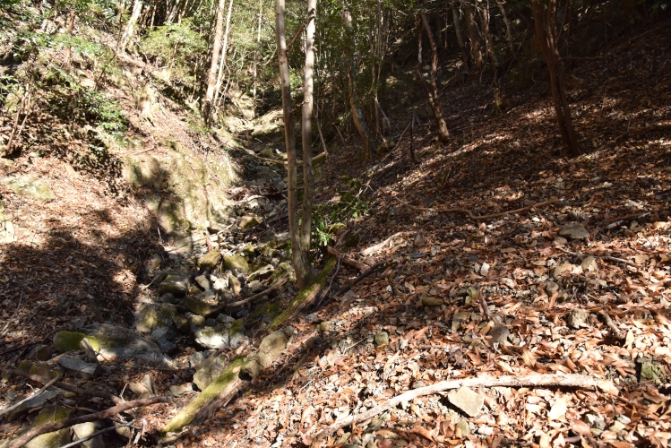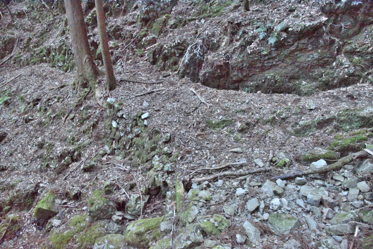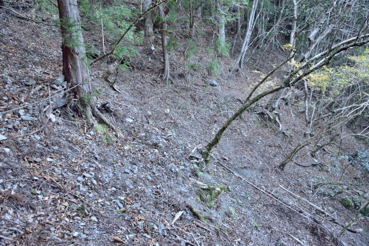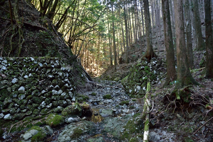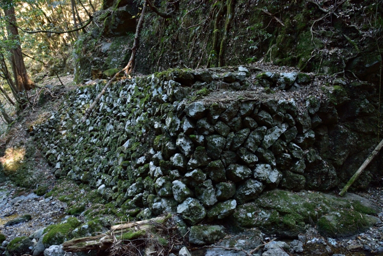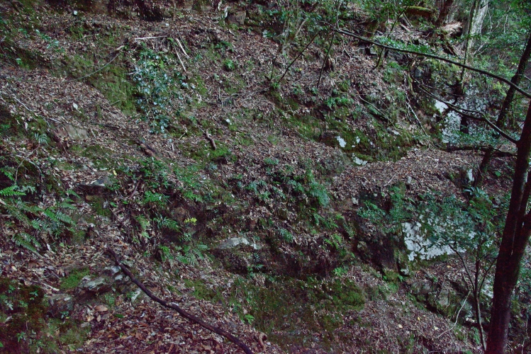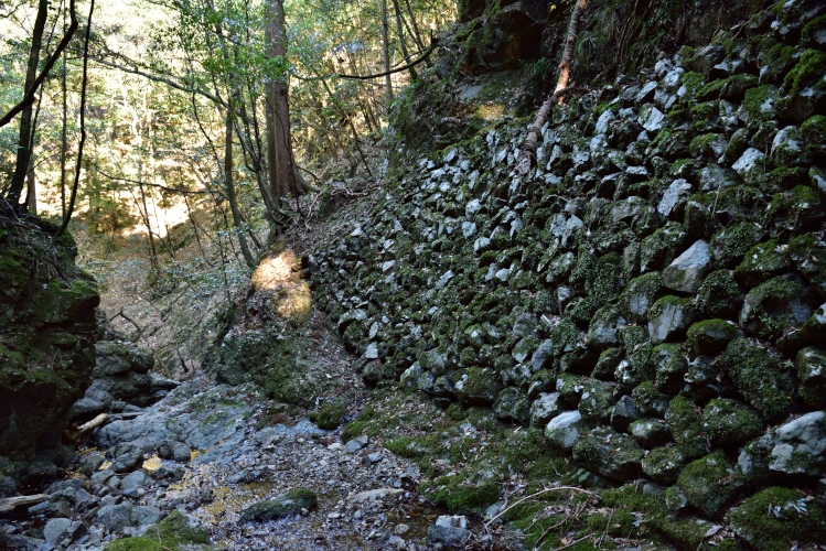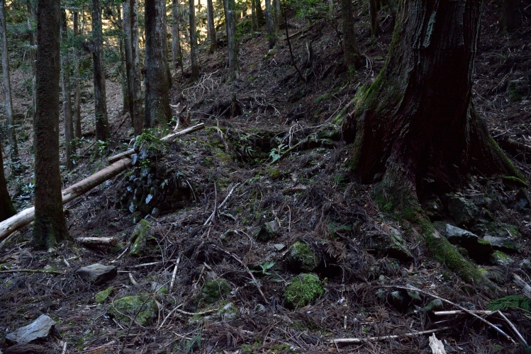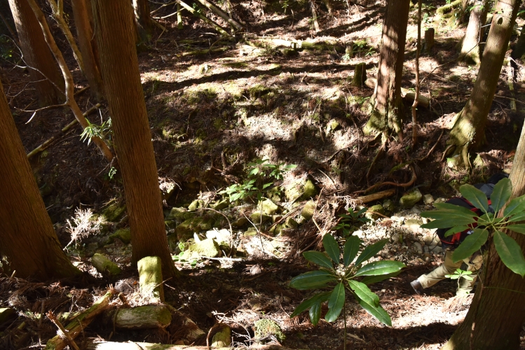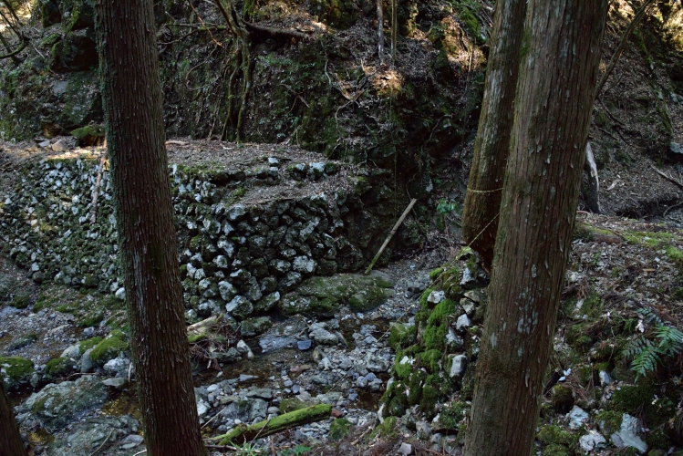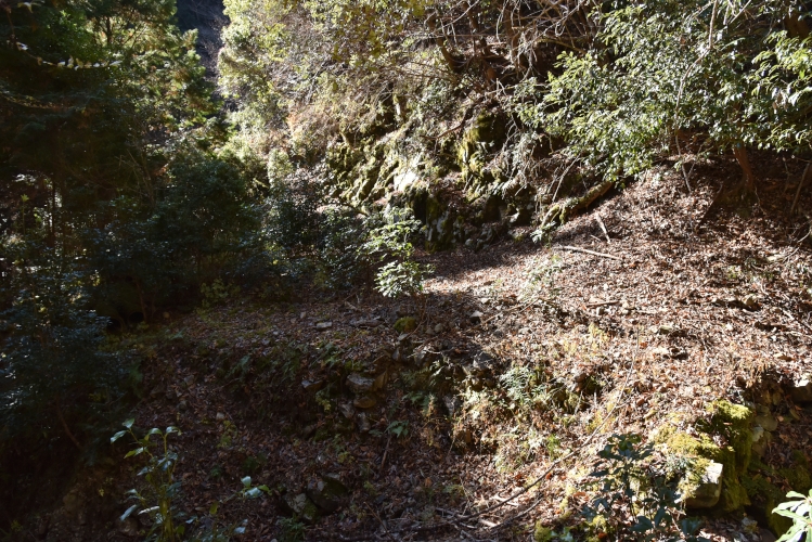 谷を回り込む道だから、対岸に道があるはずだと目をやると… 平場と石垣が…!!! |