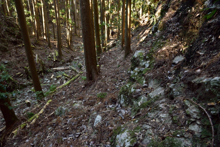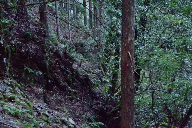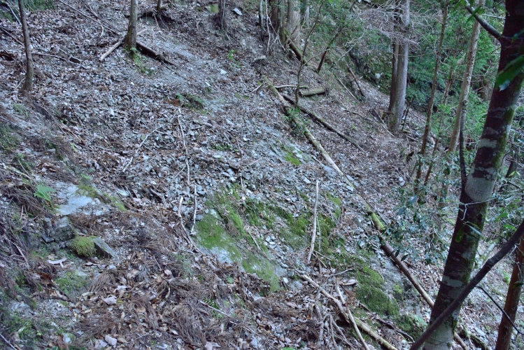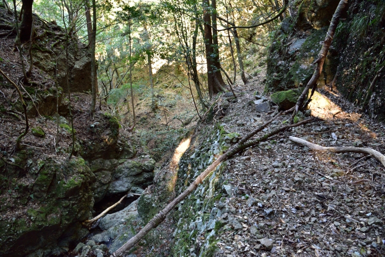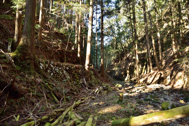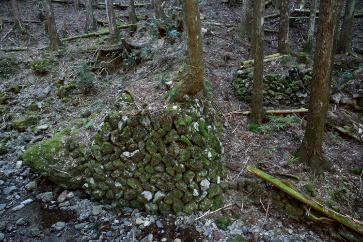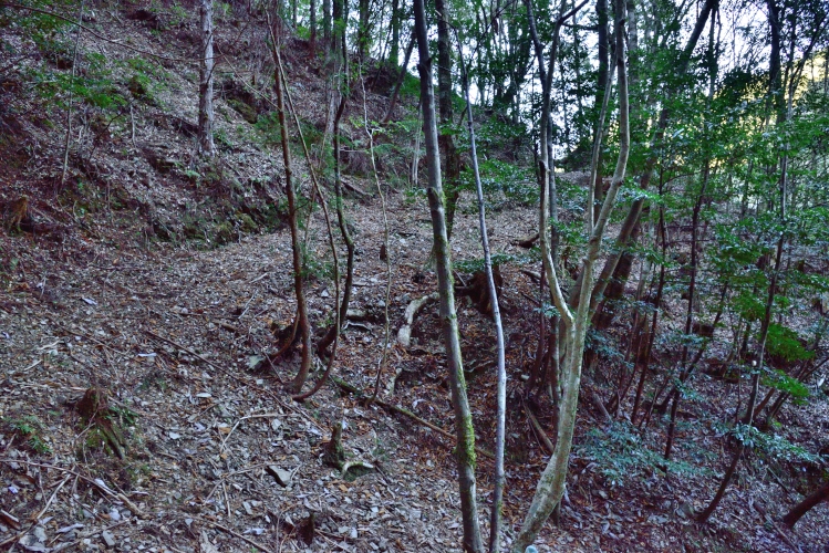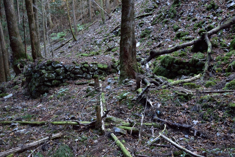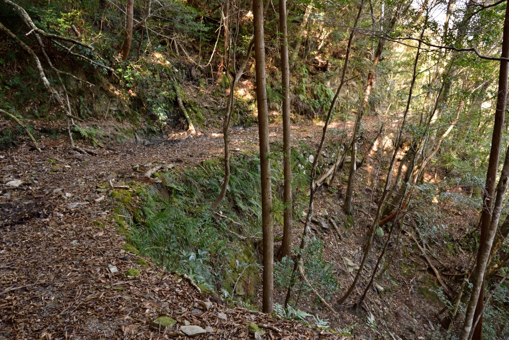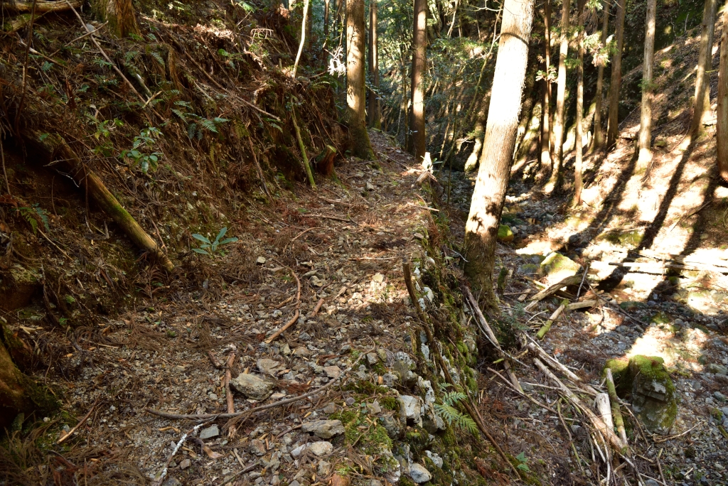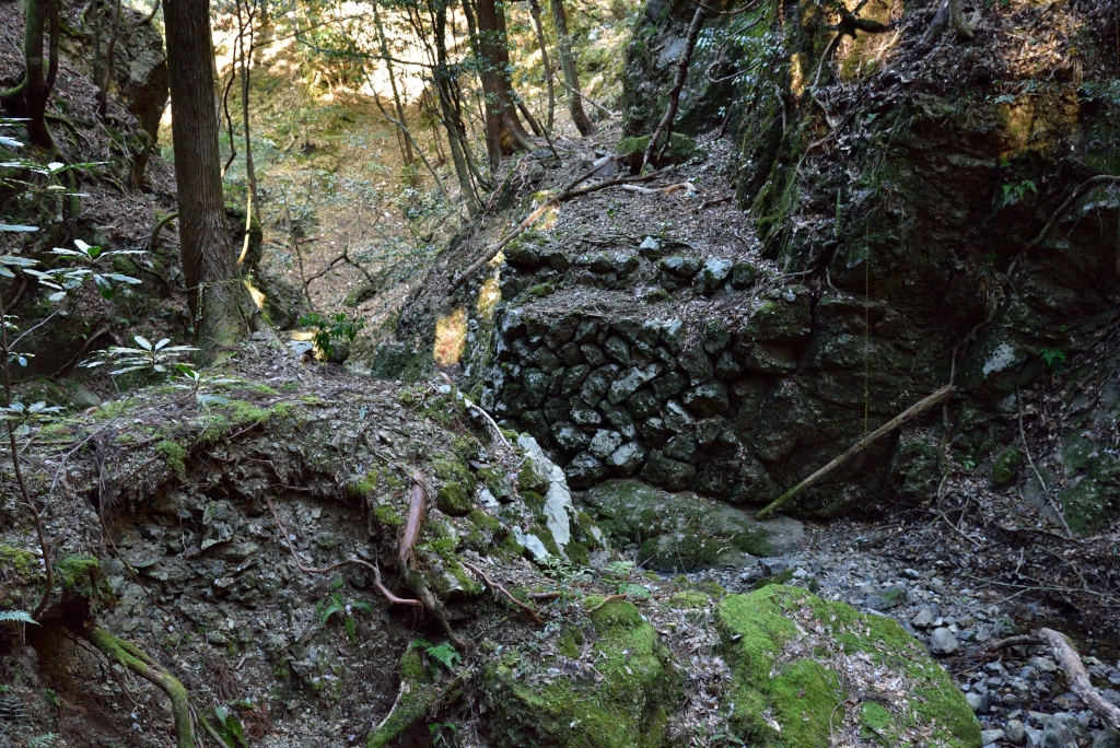 谷を回り込む道だから、対岸に道があるはずだと目をやると… 平場と石垣が…!!! |