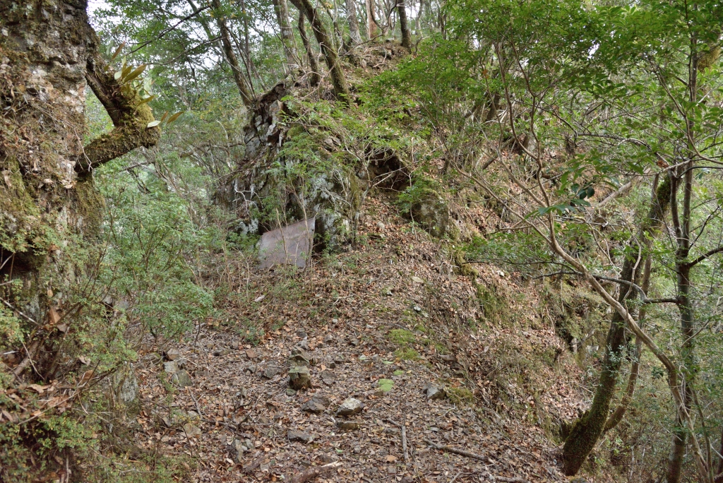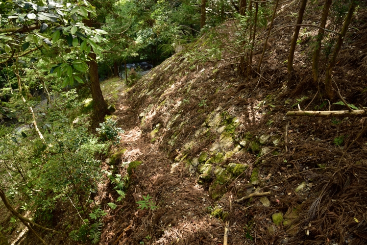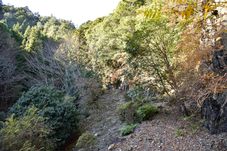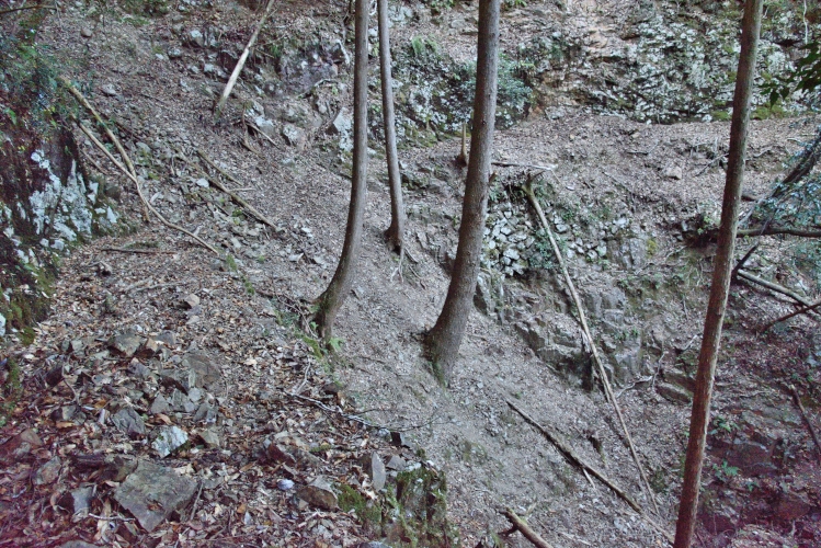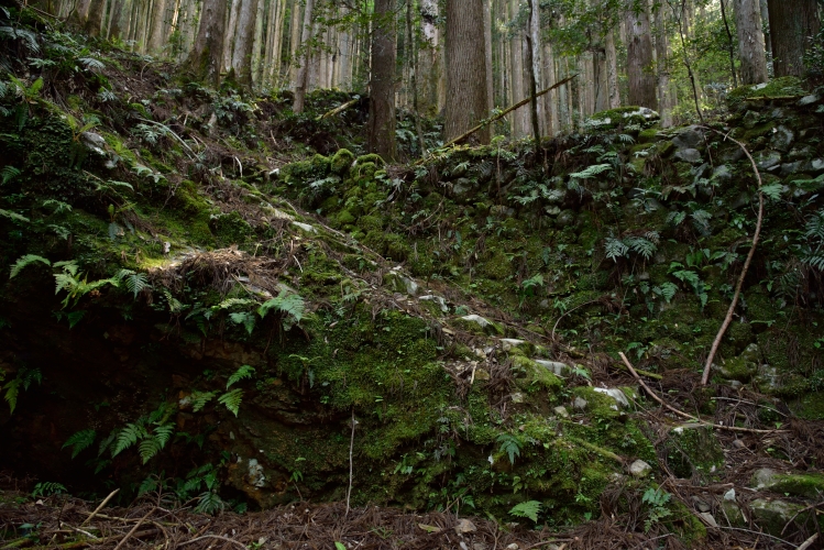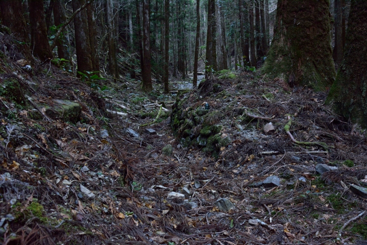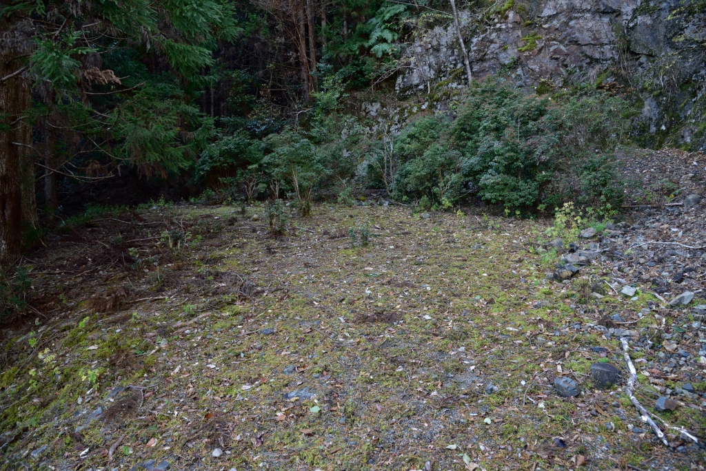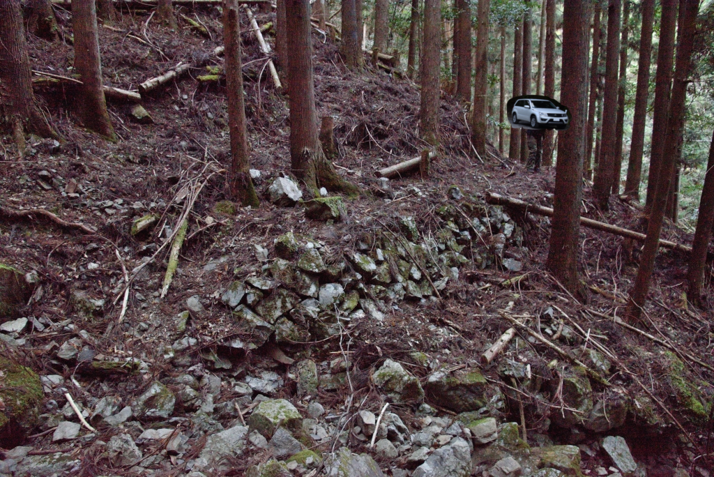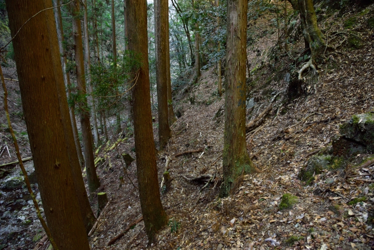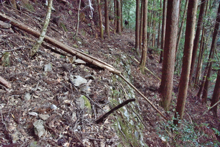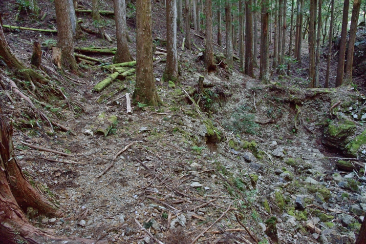 谷を回り込む道だから、対岸に道があるはずだと目をやると… 平場と石垣が…!!! |