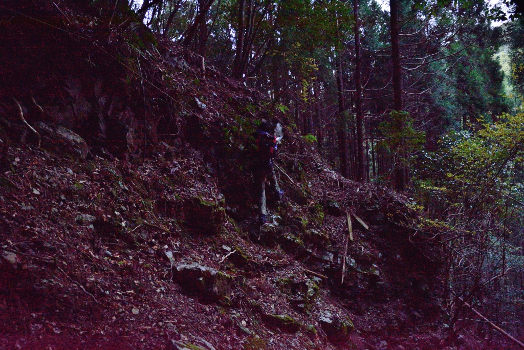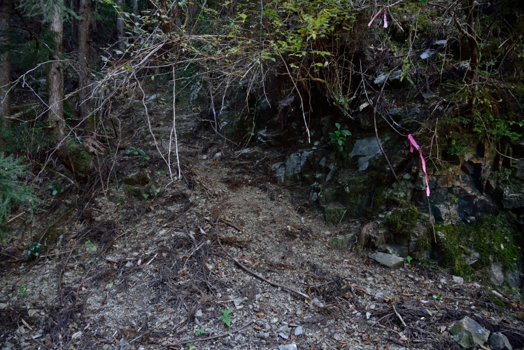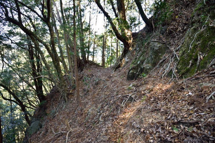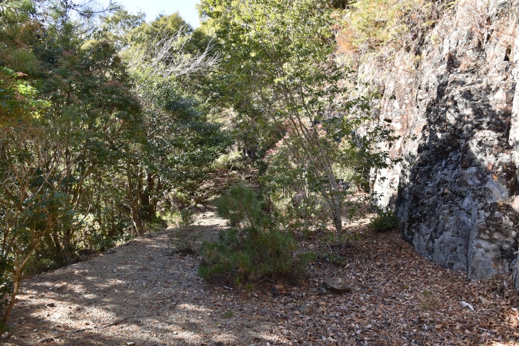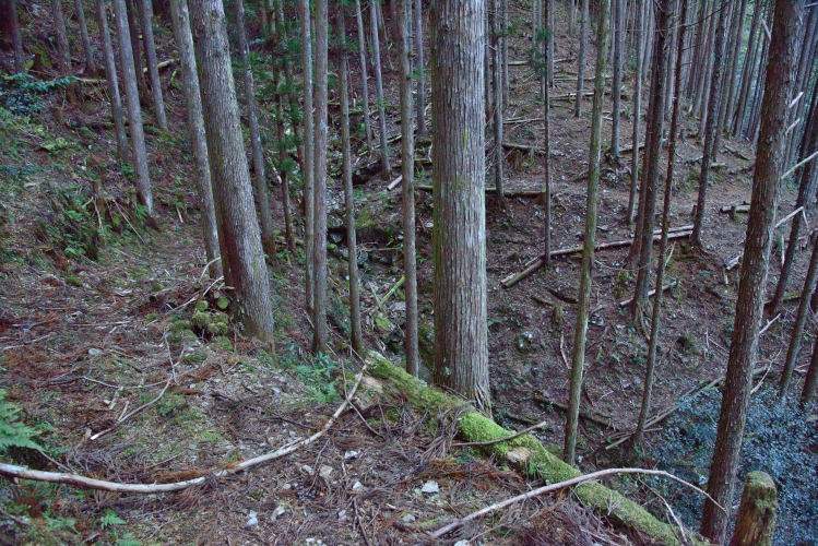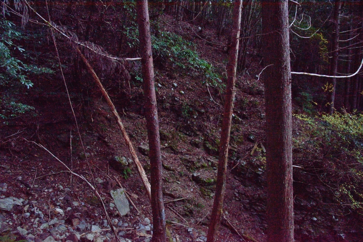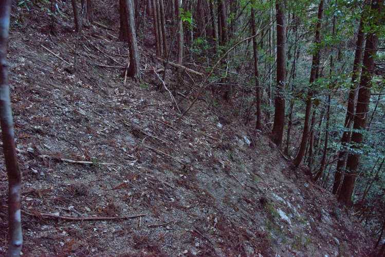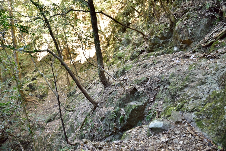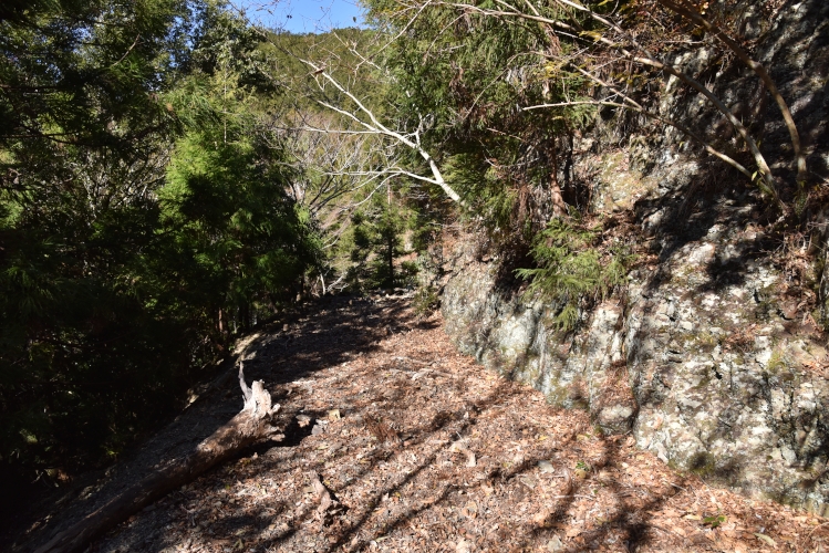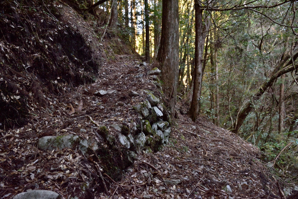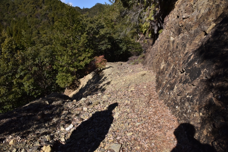 谷を回り込む道だから、対岸に道があるはずだと目をやると… 平場と石垣が…!!! |