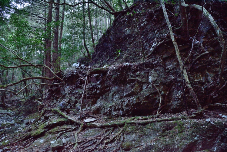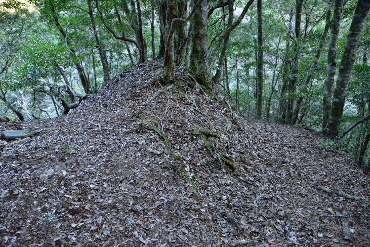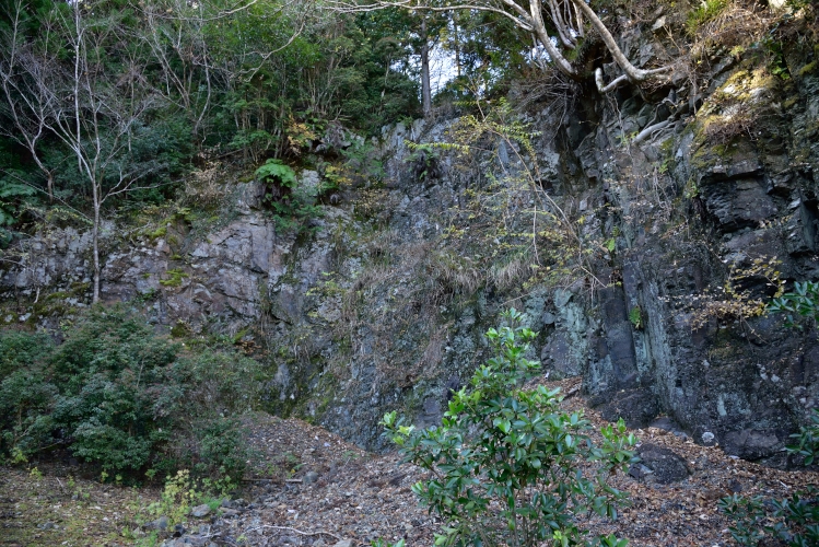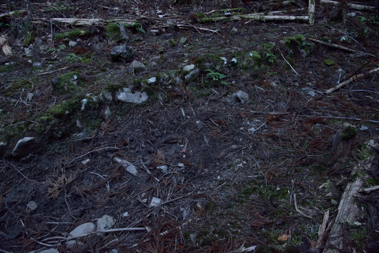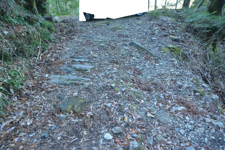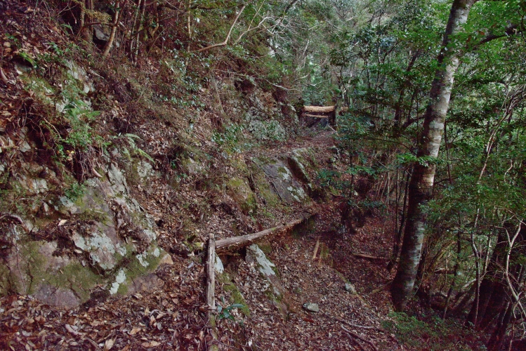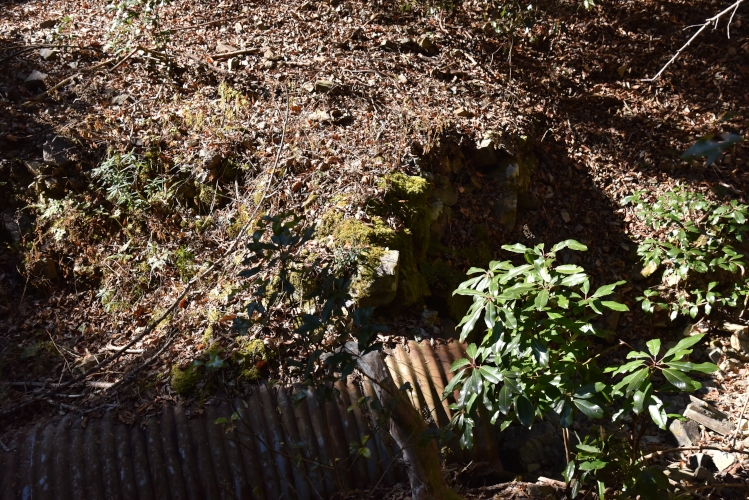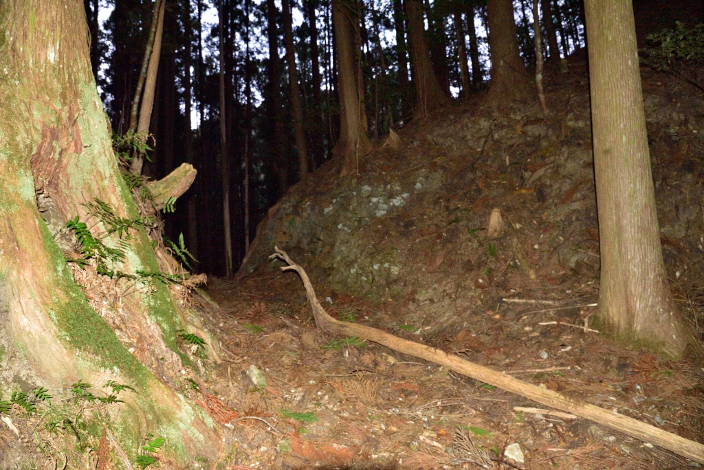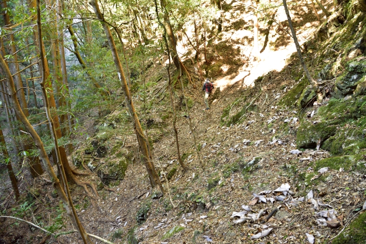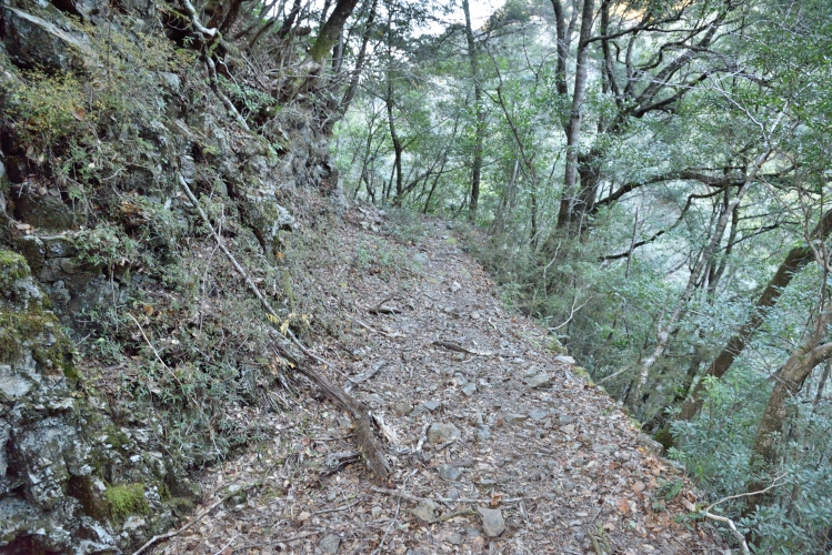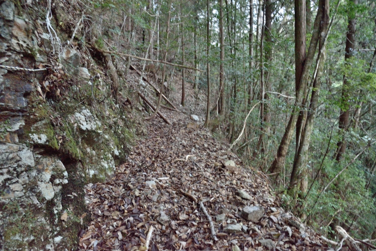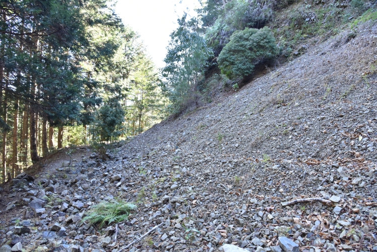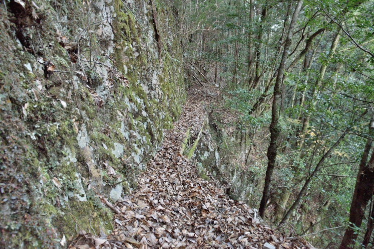 谷を回り込む道だから、対岸に道があるはずだと目をやると… 平場と石垣が…!!! |