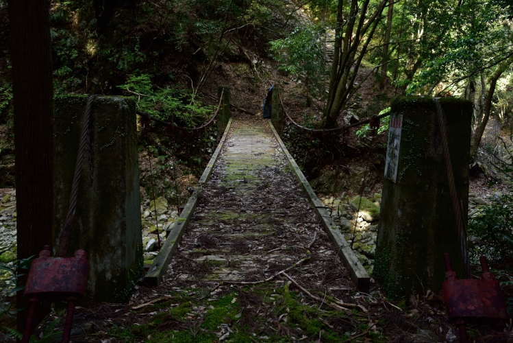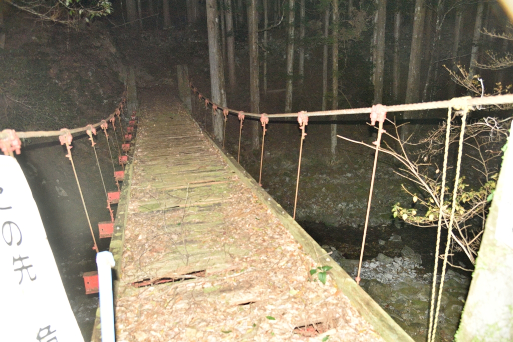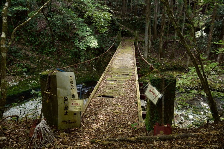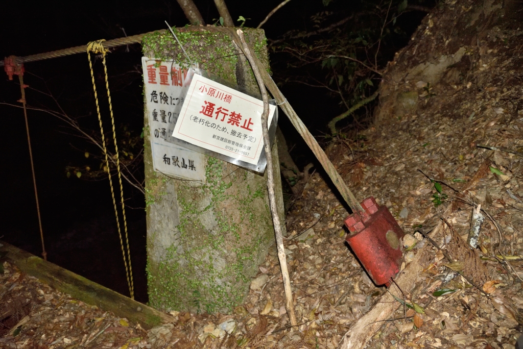 また、県道229号線側から南進する場合も、集落跡より先へのレポートはほぼない中、 先述の『村影弥太郎の集落紀行』さまでは、 県道229号線側から小原川橋を渡り、中平、そして梅木平を訪問しています。 ただ、そこから先「直進する道は橋が落ちており、また上方へ分岐する道でも路面が崩れており通行できず。」とあるのが不穏ですが…。 ※吊り橋(小原川橋)や集落跡については、 『穴と橋とあれやらこれやら』さま『中平のワケあり吊り橋【前篇】(和歌山県新宮市熊野川町畝畑)』、 『みちと標識の写真館』さま主要地方道 那智勝浦本宮線 にレポートあり。 |