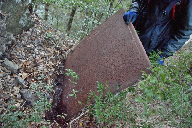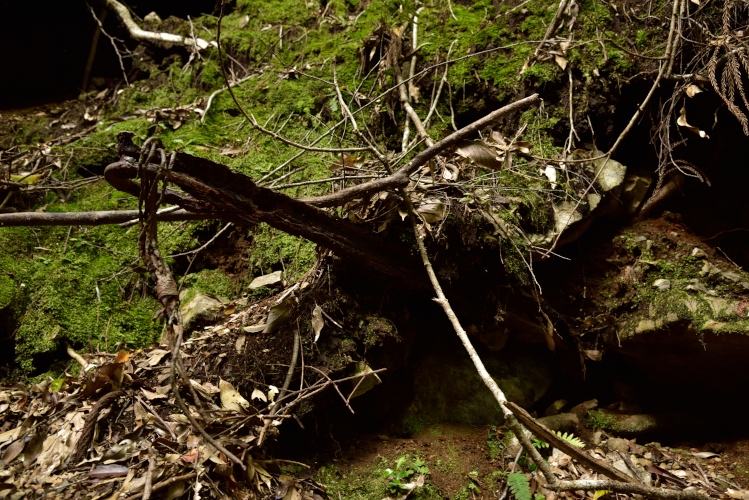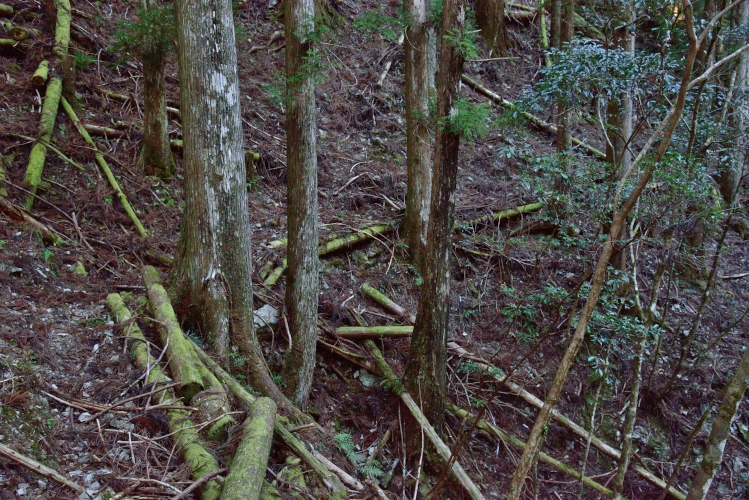 右 北長造林小屋… この石階段は、先ほど見えていたモチノキの屋敷や農地跡に続くものと思われます。 林業で使用するためだけに、このような石階段を整備したとも考えにくいので、 集落の生活道としてあったものを、林業用にも使用し、屋敷や農地があった場所に作業小屋を建設した…とかでしょうか。 |