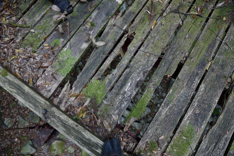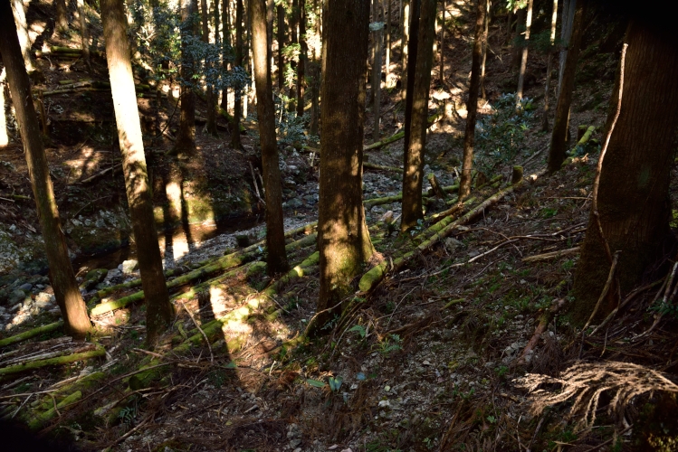 この丸太橋はまだ生きており、そう遠くない昔に林業事業者により整備されたはず。 明らかな人の手、気配を感じ、畝畑までは安定した道が続くのでは…と考えます。 |