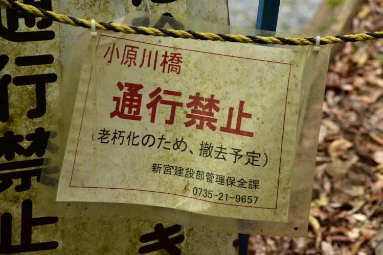 その先、通行禁止の文句で飾り付けられた小原川橋が現れました。 対岸の石垣たちが気になるところですが、 |