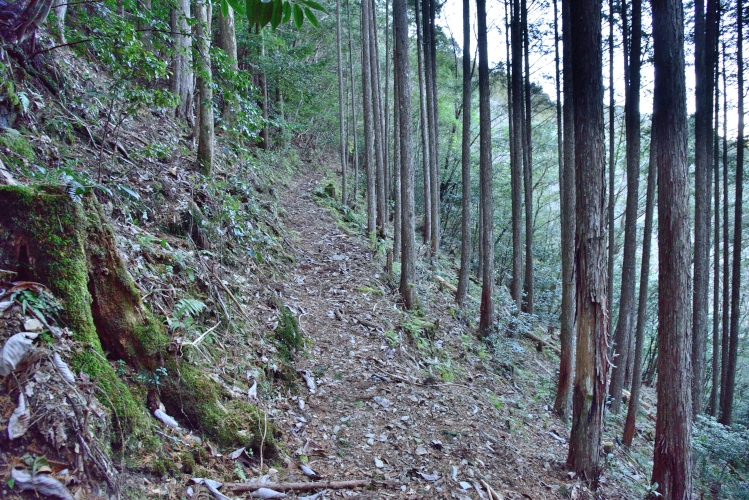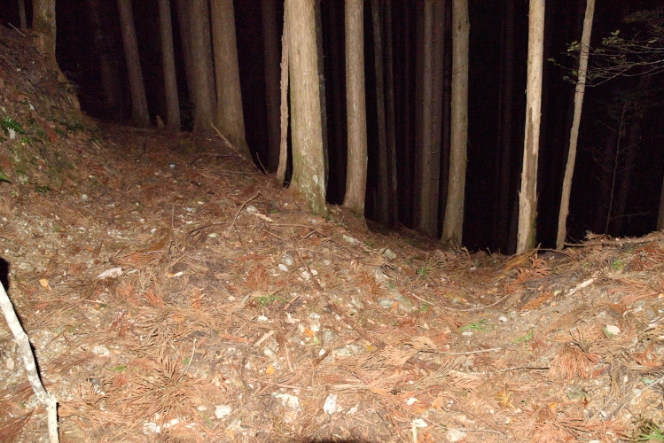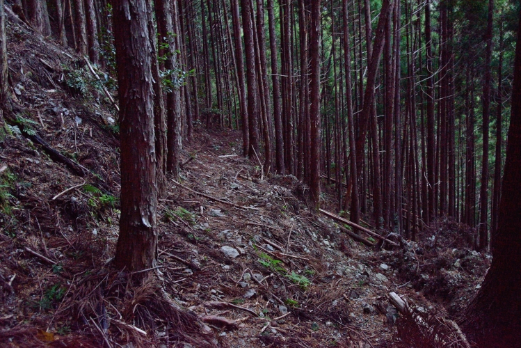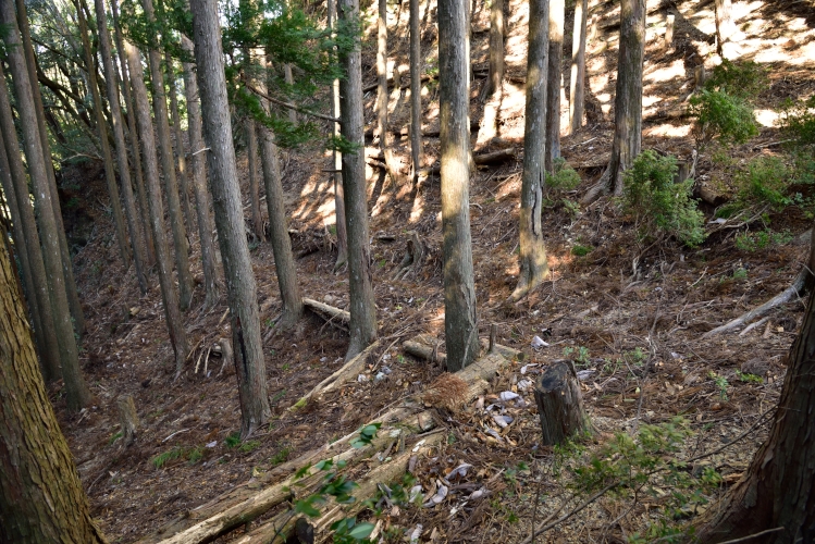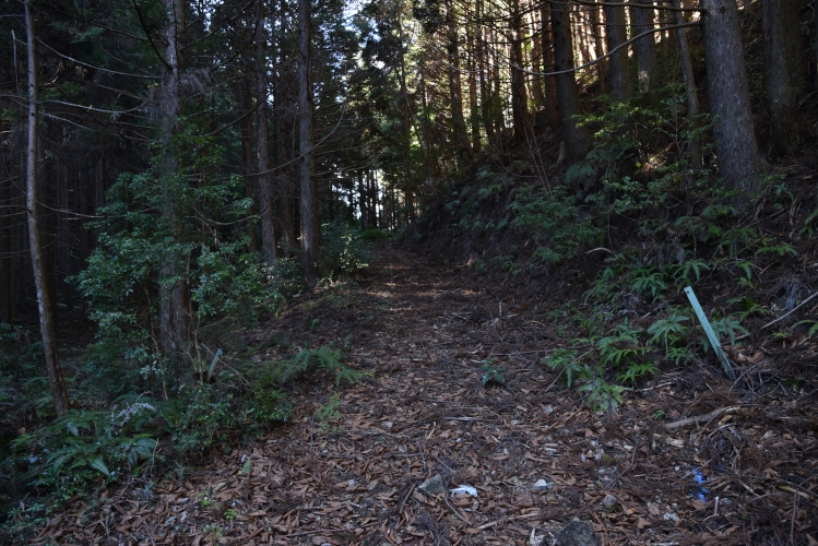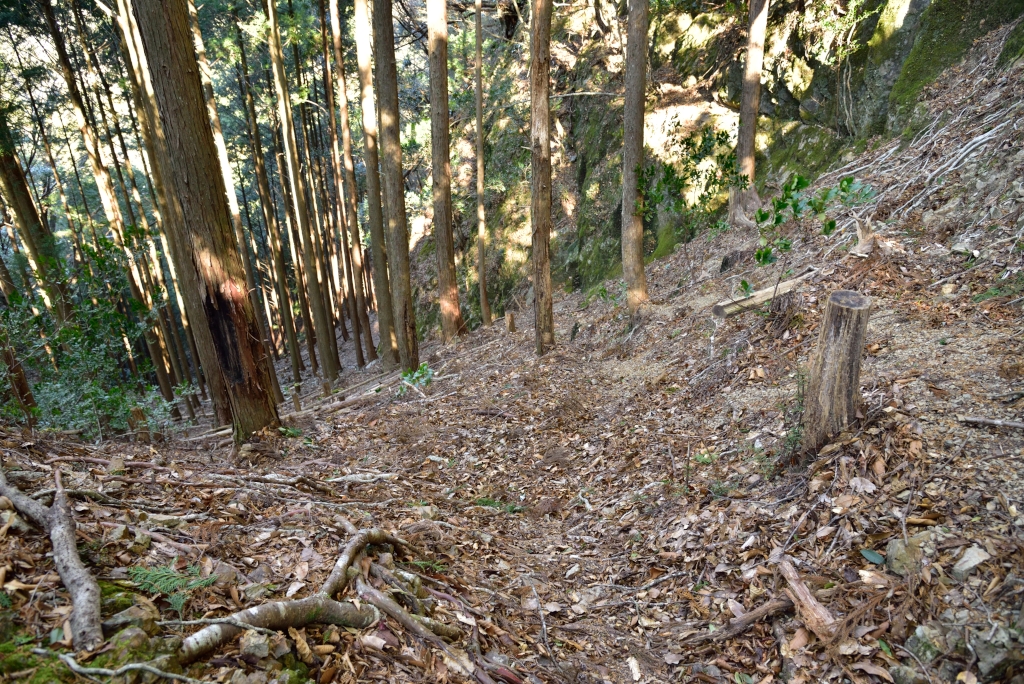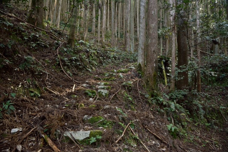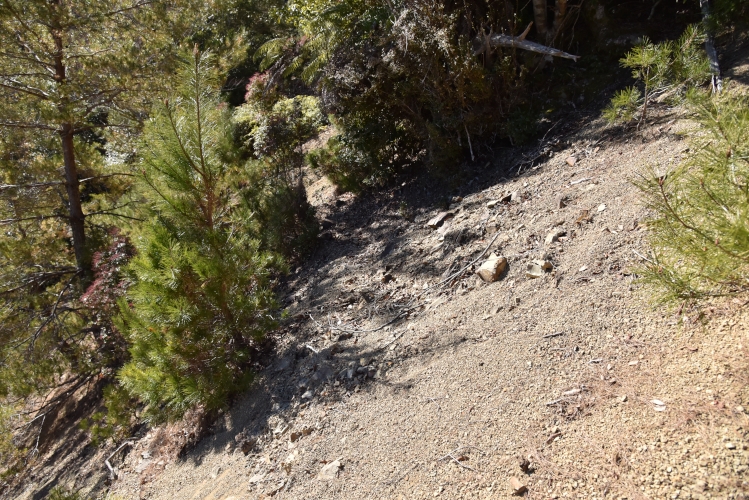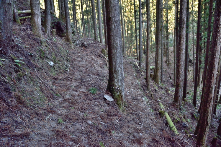 農地跡か植林の際に整備したのか、段差があり、 一見道が消失したようですが、進めてしまいます。 |