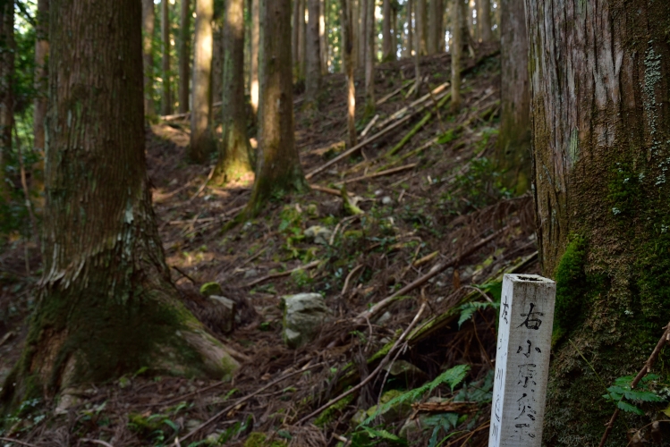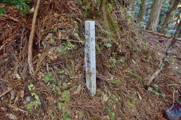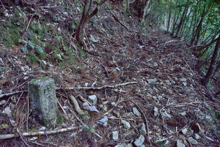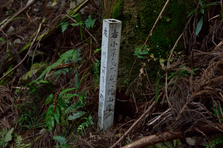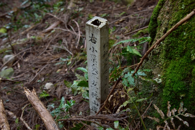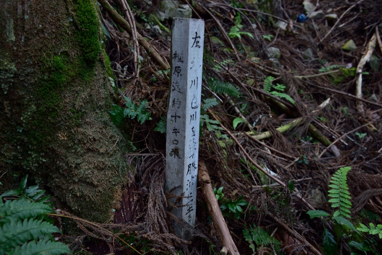 左側の登り勾配に入ってすぐ、 左 北長造林小屋 右 畝畑小口…熊野川…至… 四面のうち二面のみ確認して残りを忘れるという痛恨のミスをやらかしましたが、 形状からして、中平集落跡にあった道標と同じ「昭和四十七年十月」と思われます。 |