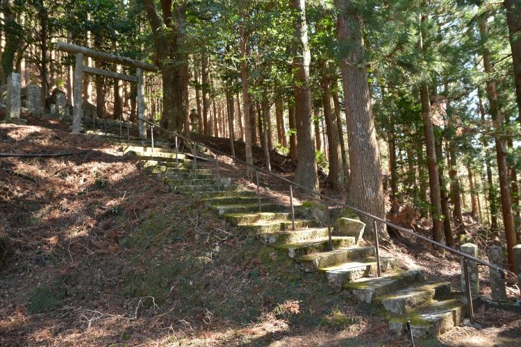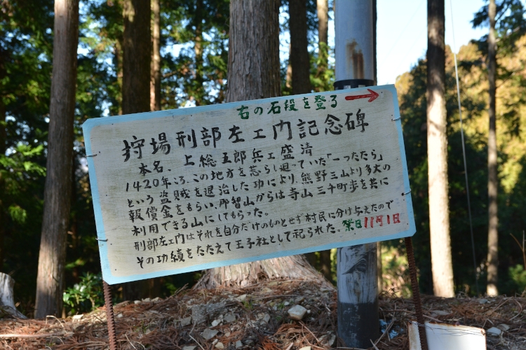 右の石段を登る→ 狩場刑部左衛門記念碑 本名.上総五郎兵ェ盛清 1420年ころ.この地方を莣らし廻っていた「一つたたら」 という盗賊を退治した功により.熊野三山より多大の 報償金をもらい.那智山からは寺山三千町歩を共に 利用できる山にしてもらった。 刑部左ェ門はそれを自分だけのものとせず村民に分け与えたので その功績をたたえて王子社として祀られた。祭日11月1日 (2019年2月撮影) |