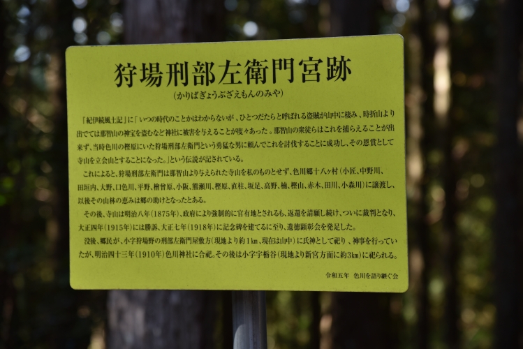 狩場刑部左衛門宮跡 (かりばぎょうぶざえもんのみや) 「紀伊続風土記」に「いつの時代のことかはわからないが、ひとつだたらと呼ばれる盗賊が山中に棲み、時折山より 出ては那智山の神宝を盗むなど神社に被害を与えることが度々あった。那智山の衆徒らはこれを捕らえることが出 来ず、当時色川の樫原にいた狩場刑部左衛門という勇猛な男に頼んでこれを討伐することに成功し、その恩賞として 寺山を立会山とすることになった。」という伝説が記されている。 これによると、狩場刑部左衛門は那智山より与えられた寺山を私のものとせず、色川郷十八ヶ村(小匠、中野川、 田垣内、大野、口色川、平野、檜曾原、小阪、熊瀬川、樫原、直柱、坂足、高野、楠、樫山、赤木、田川、小森川)に譲渡し、 以後その山林の恵みは郷の助けとなったとある。 その後、寺山は明治八年(1875年)、政府により強制的に官有地とされるも、返還を請願し続け、ついに裁判となり、 大正四年(1915年)には勝訴、大正七年(1918年)に記念碑を建てるに至り、遺徳顕彰会を発足した。 没後、郷民が、小字狩場野の狩場刑部左衛門屋敷方(現地より約1km、現在は山中)に氏神として祀り、神事を行ってい たが、明治四十三年(1910年)色川神社に合祀。その後は小字字栃谷(現地より新宮方面に約3km)に祀られる。 令和五年 色川を語り継ぐ会 |