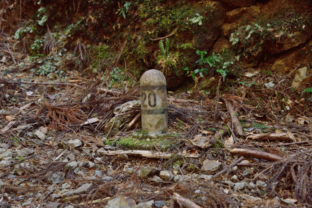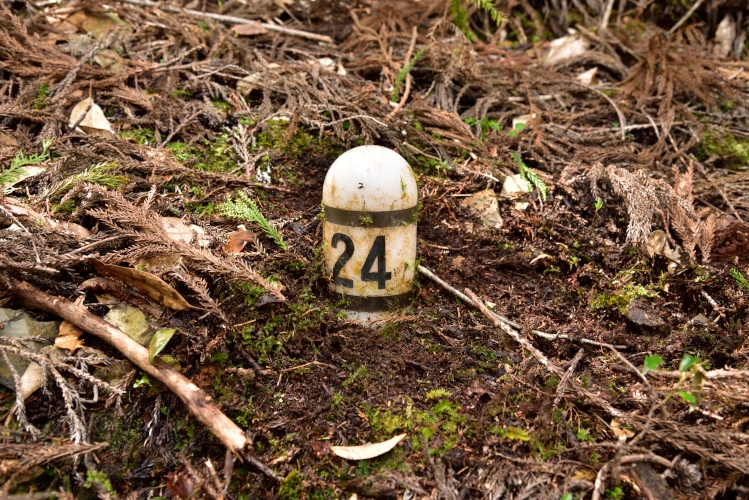 24 これはまきのじ氏の投稿にあったキロポストに違いありません! Googleマップ計測だと、ここは起点(和歌山県東牟婁郡那智勝浦町八尺鏡野)から26.8km地点、 地理院地図計測で、終点(和歌山県田辺市本宮町請川)から約24km地点でした。 ここに来るまで、同様のキロポストは(見逃している可能性も高いものの)見かけませんでした。 当時和歌山県内で使用されていたものが、今も撤去されずに残っている…のかもしれません。 (2025年3月撮影) |