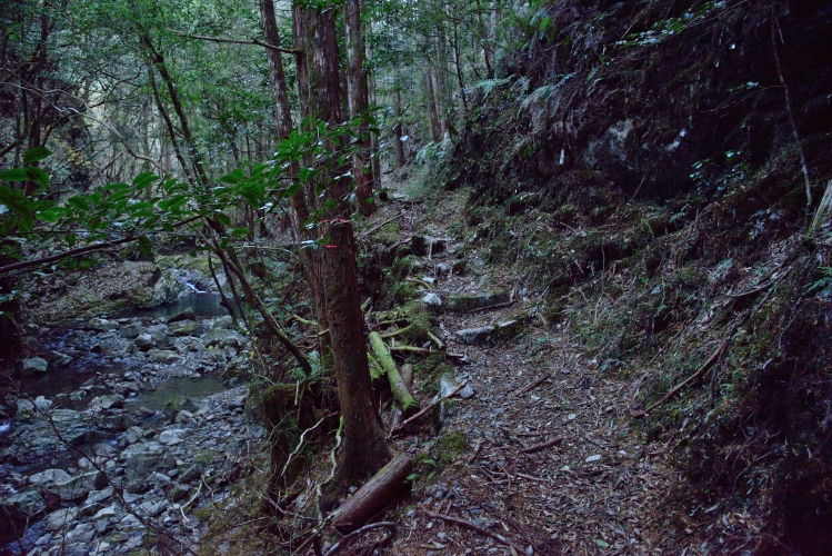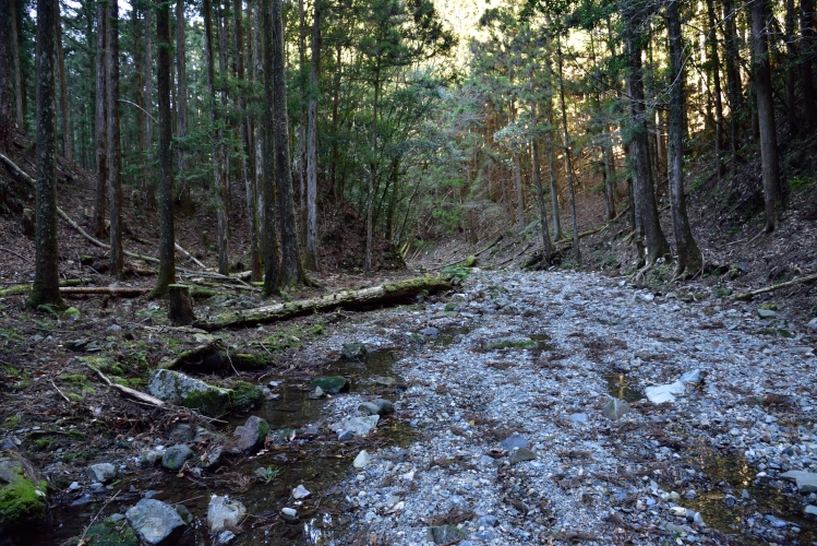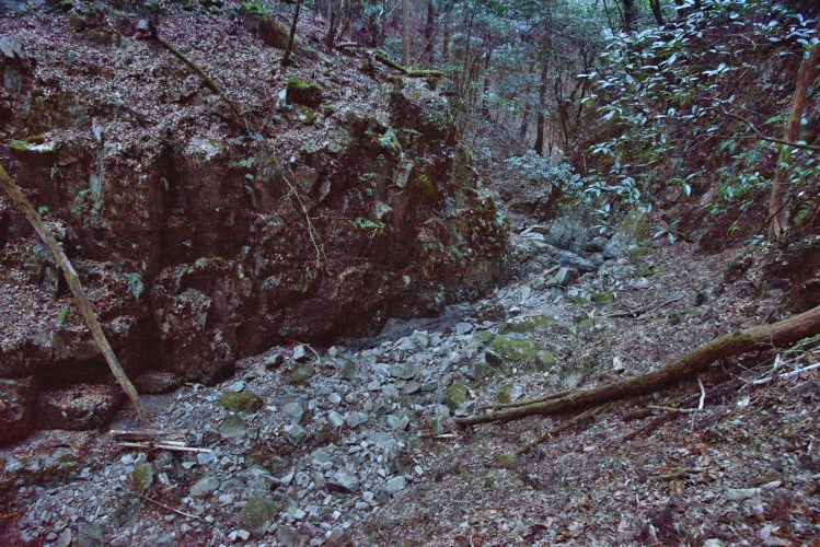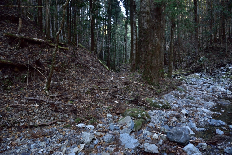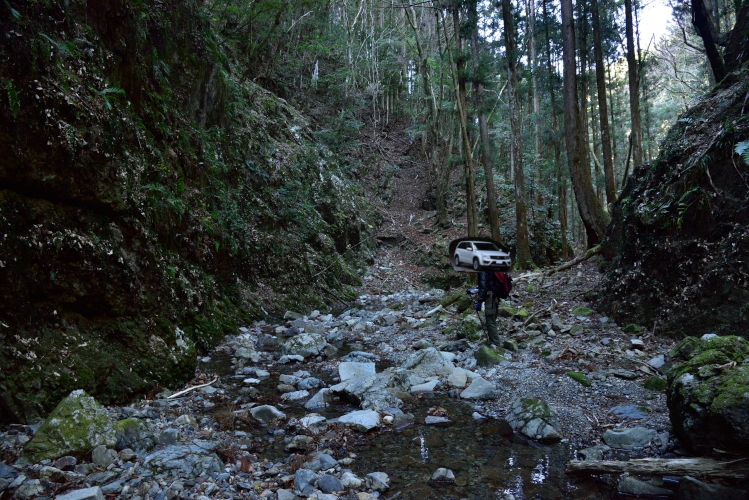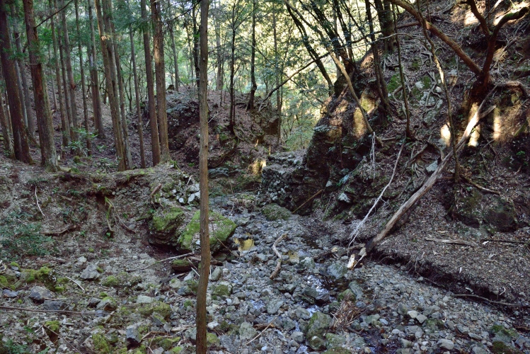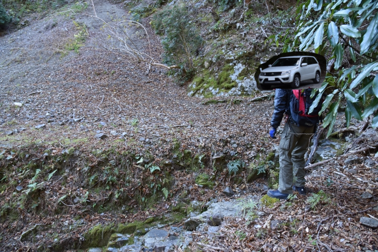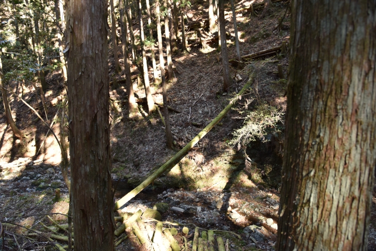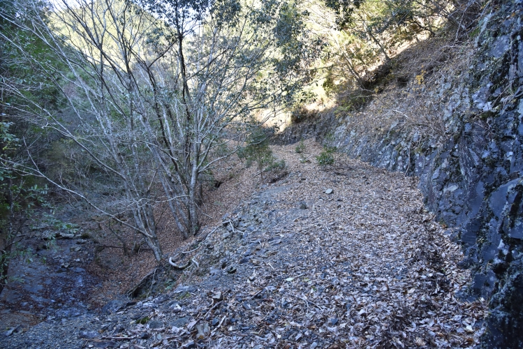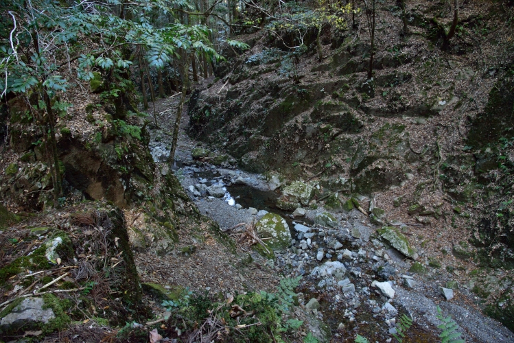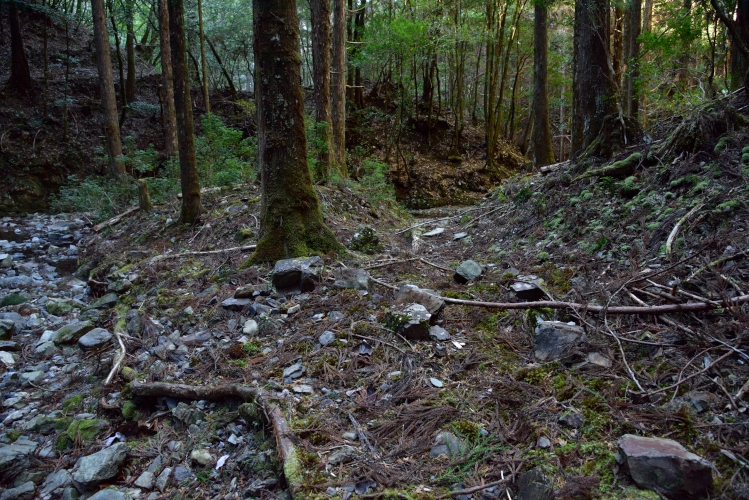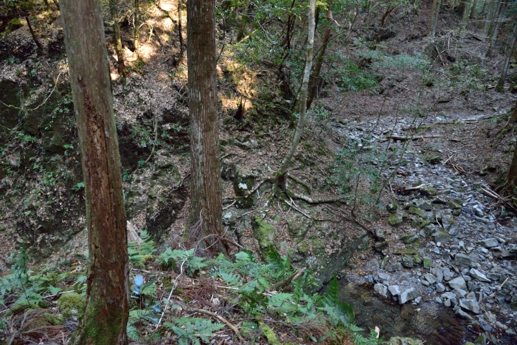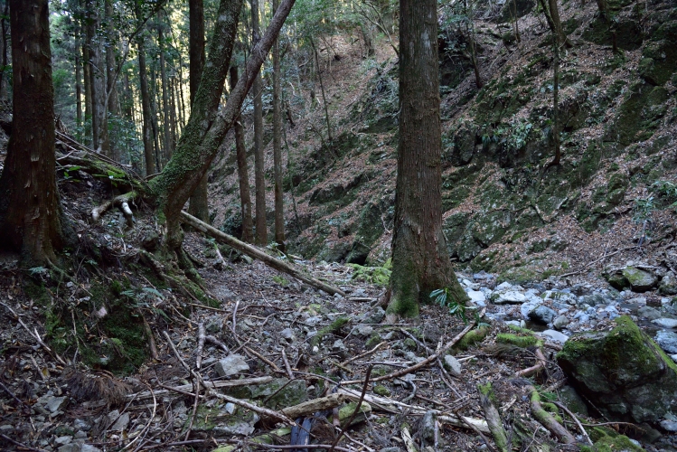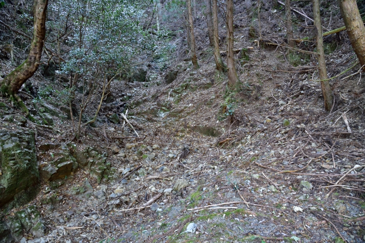 急勾配な路面を無理矢理登ってきたものの(上記表の2.2km地点)、 谷沿いをさらに進む道筋は見えず、ここで谷を渡っても彼岸に道筋は見えません。 |