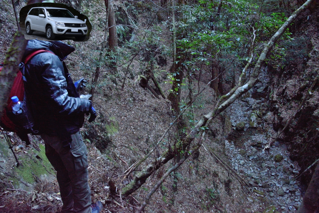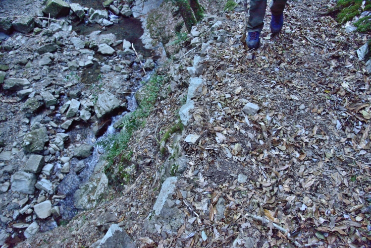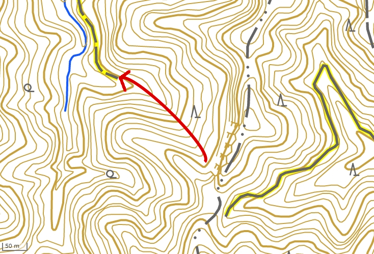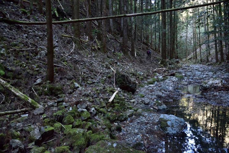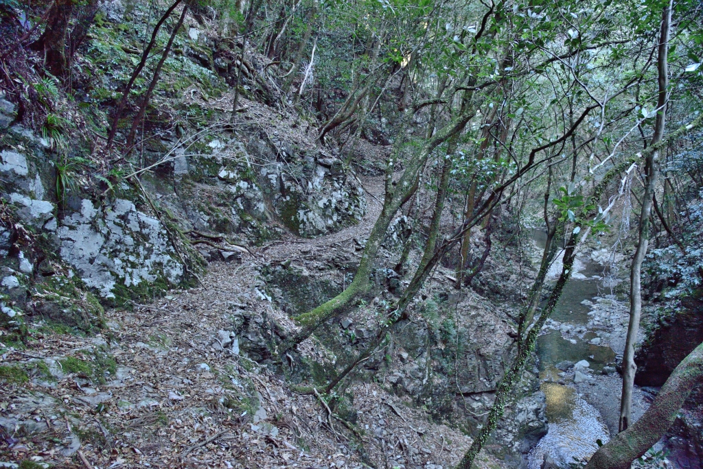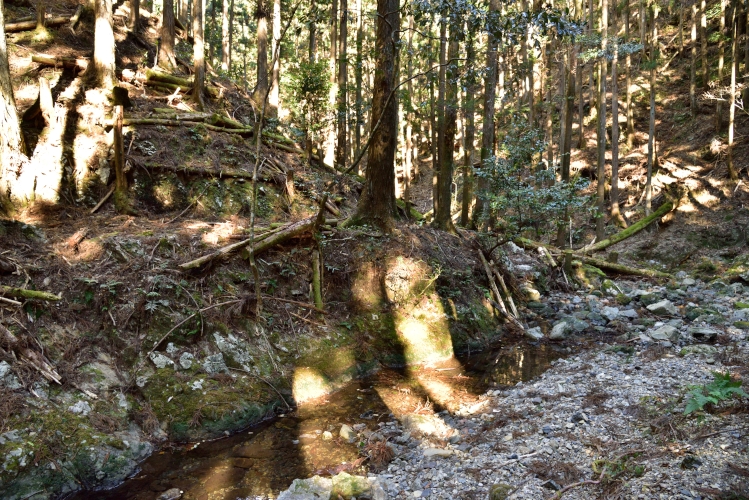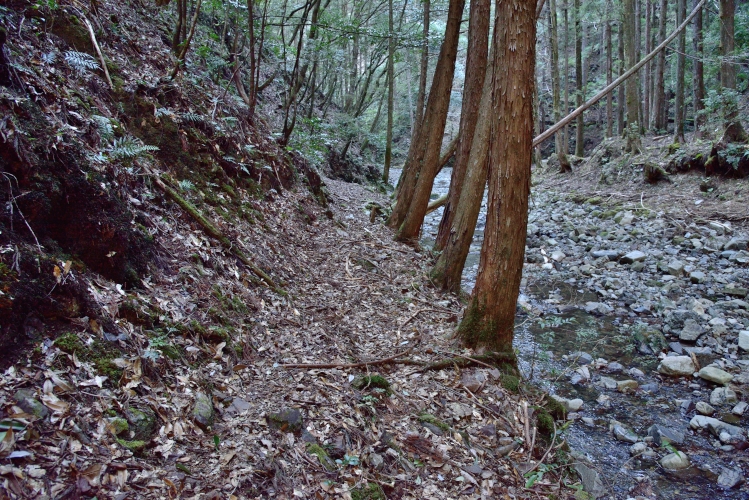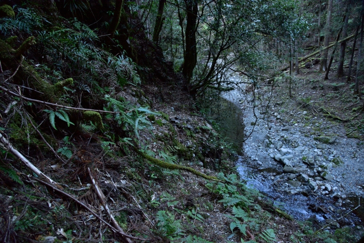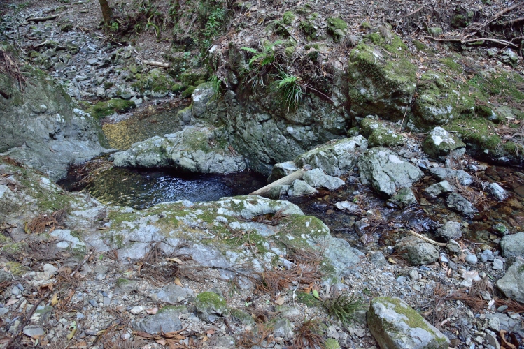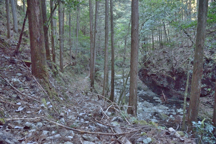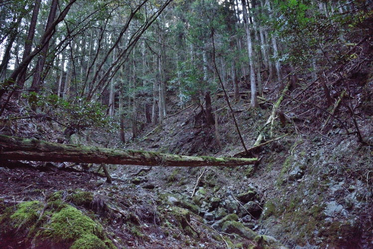 急勾配な路面を無理矢理登ってきたものの(上記表の2.2km地点)、 谷沿いをさらに進む道筋は見えず、ここで谷を渡っても彼岸に道筋は見えません。 |