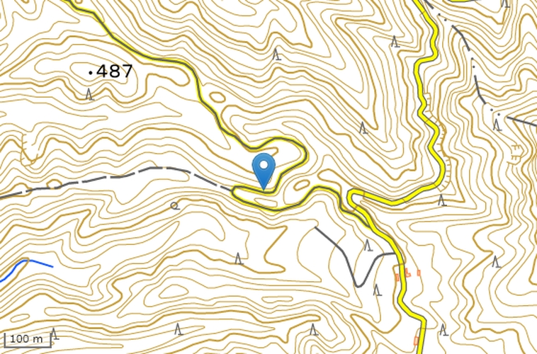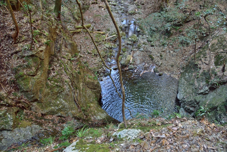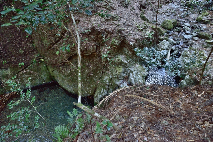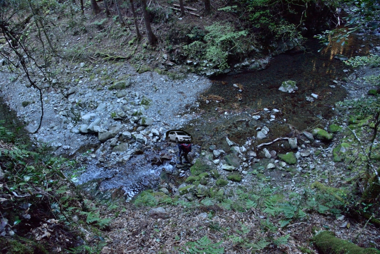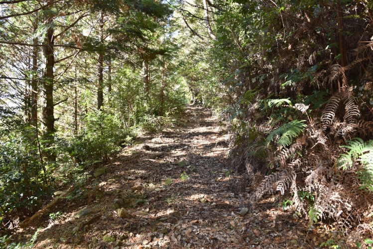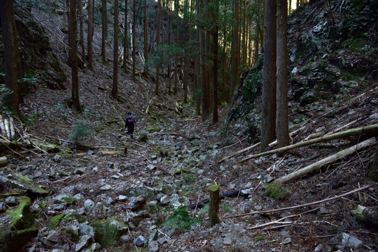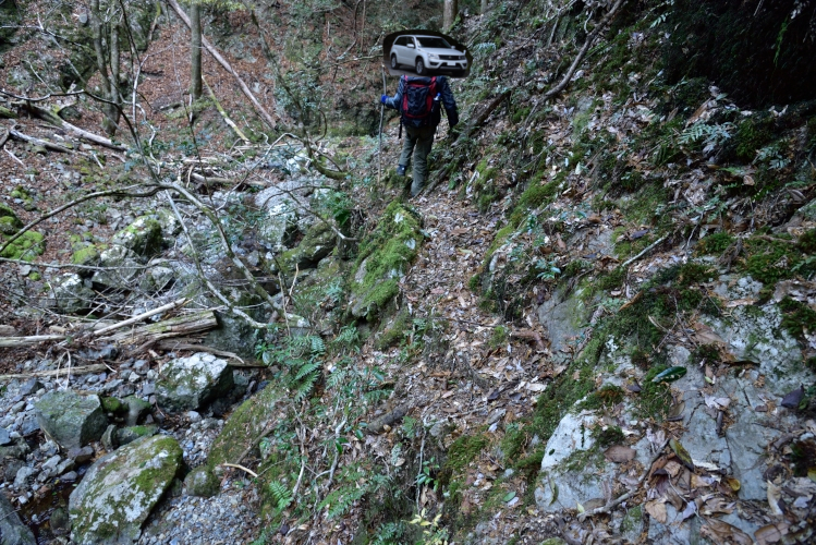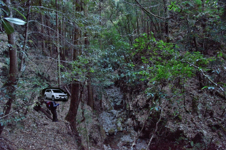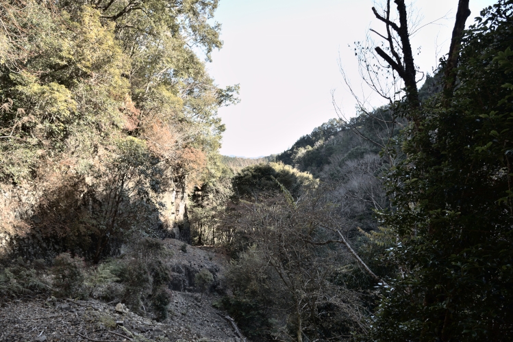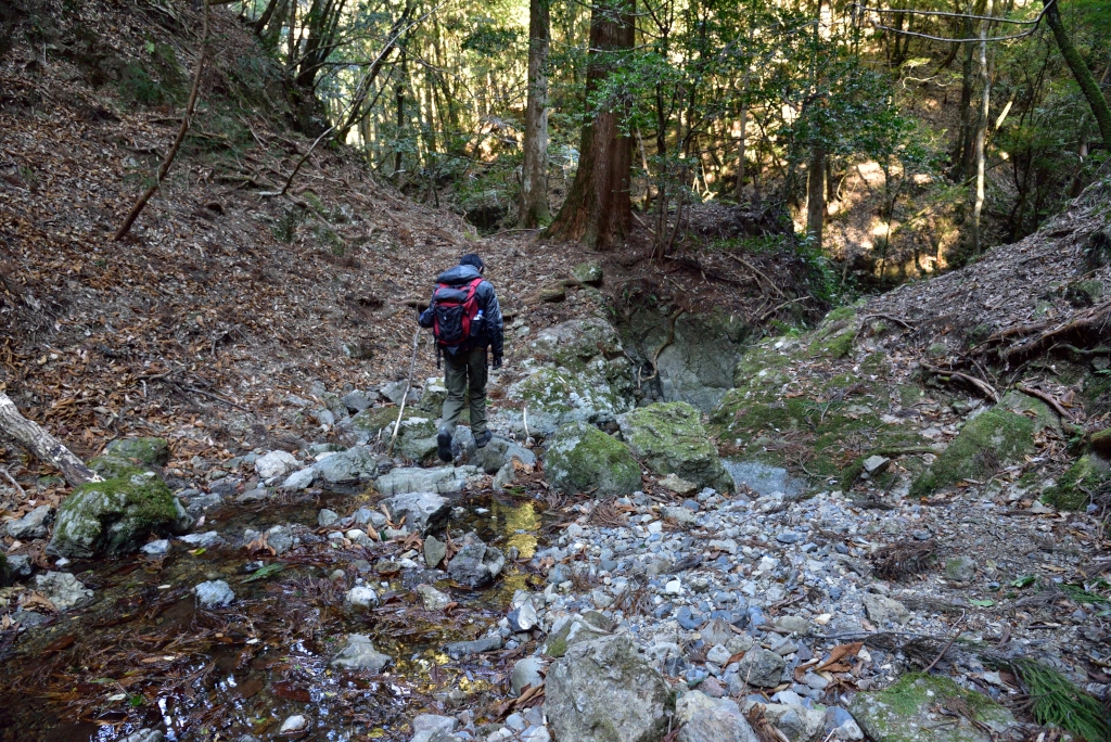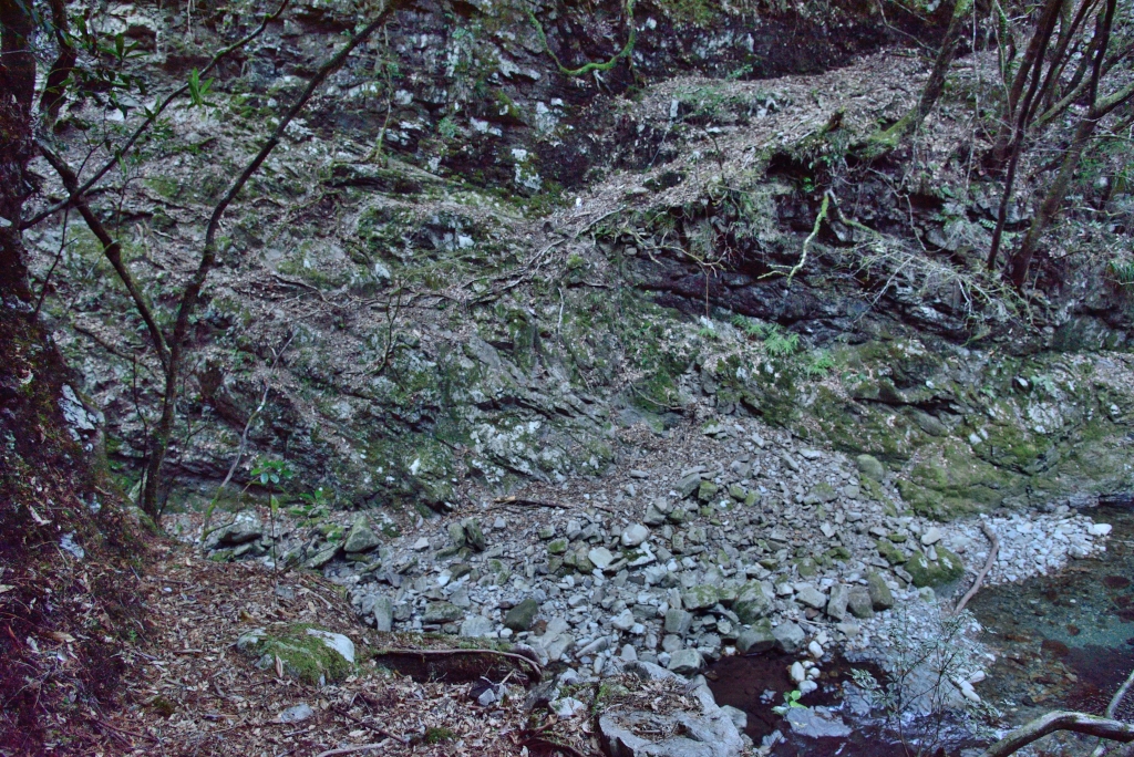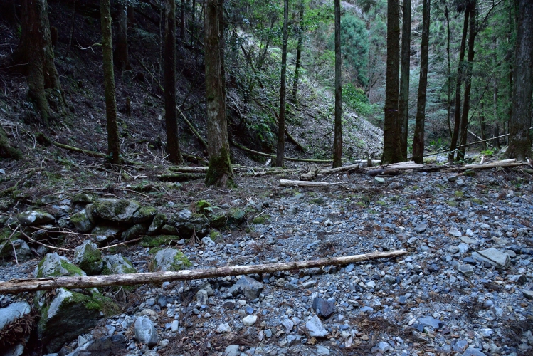 急勾配な路面を無理矢理登ってきたものの(上記表の2.2km地点)、 谷沿いをさらに進む道筋は見えず、ここで谷を渡っても彼岸に道筋は見えません。 |
