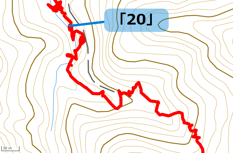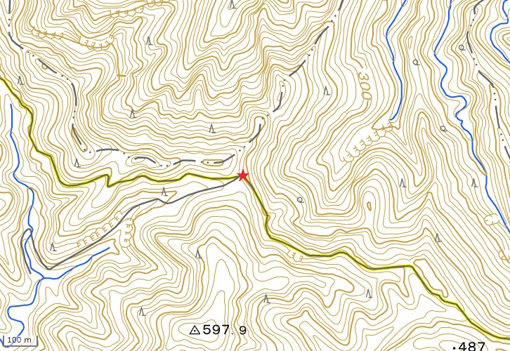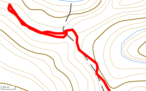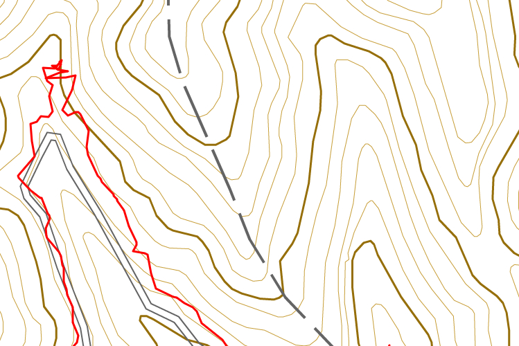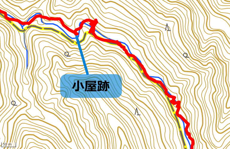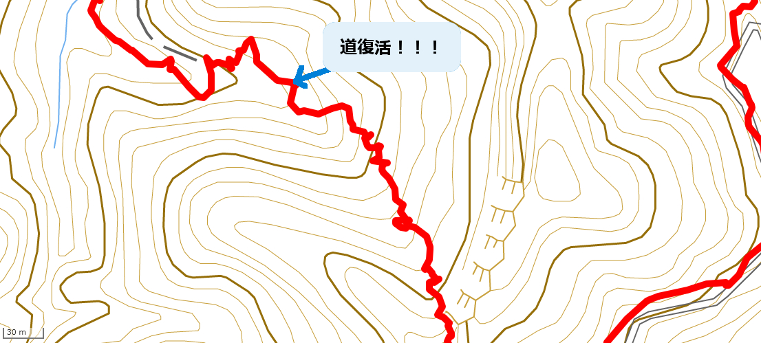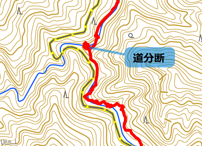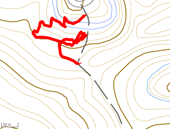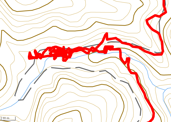 GPSを確認すると、少し手前で谷を渡っています。 ※わちゃわちゃしているのが、谷沿いに道はないか、対岸に道はないかとしている軌跡です。 |