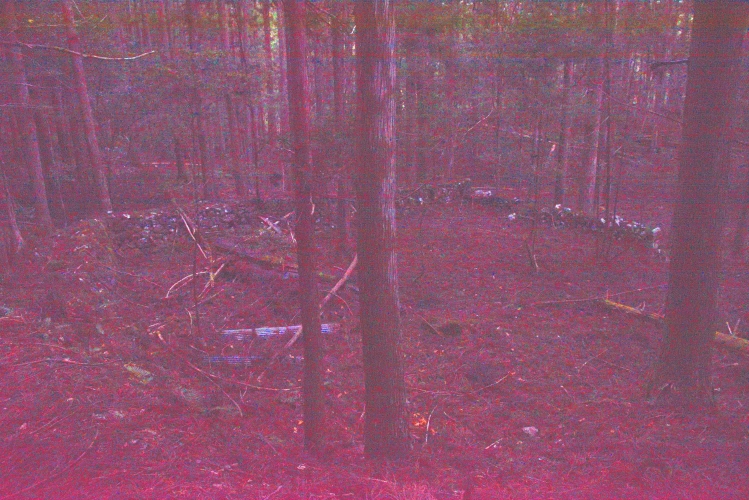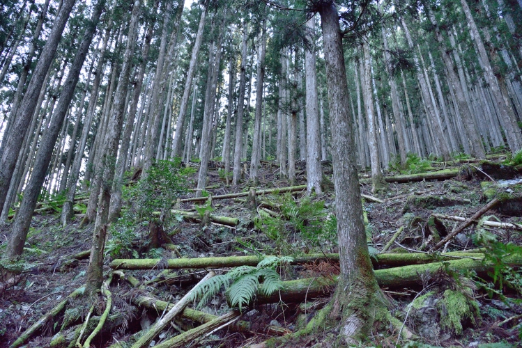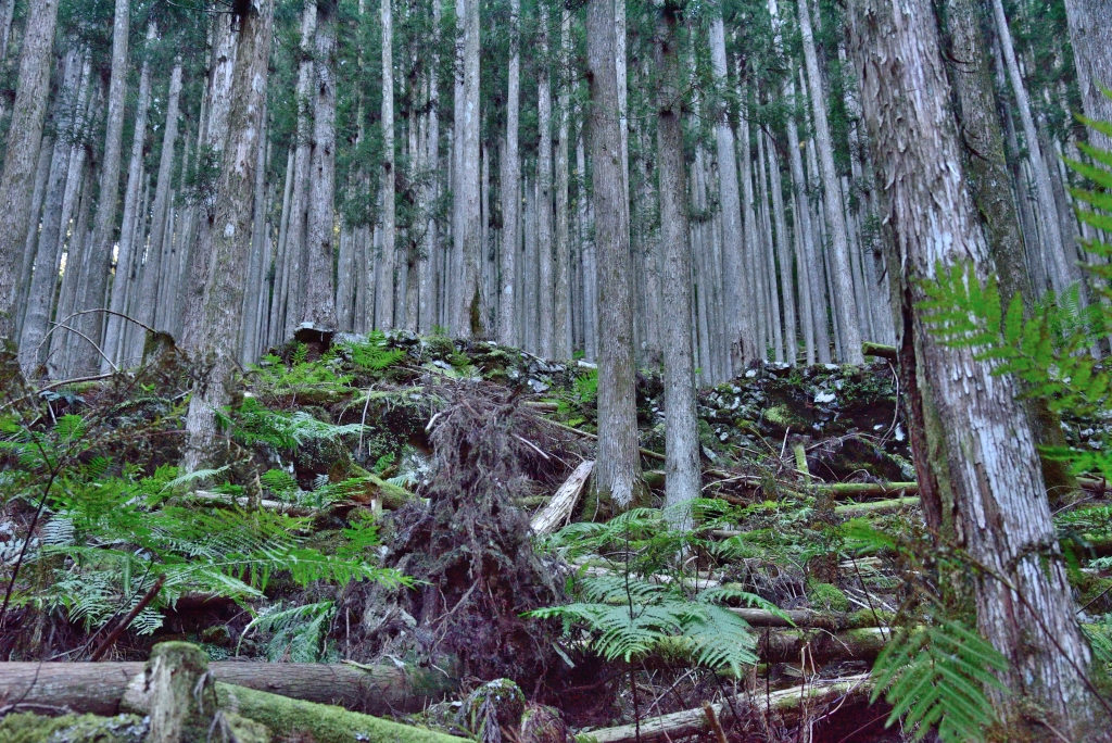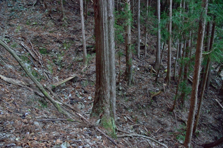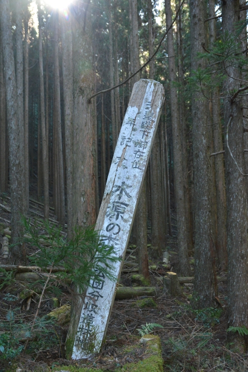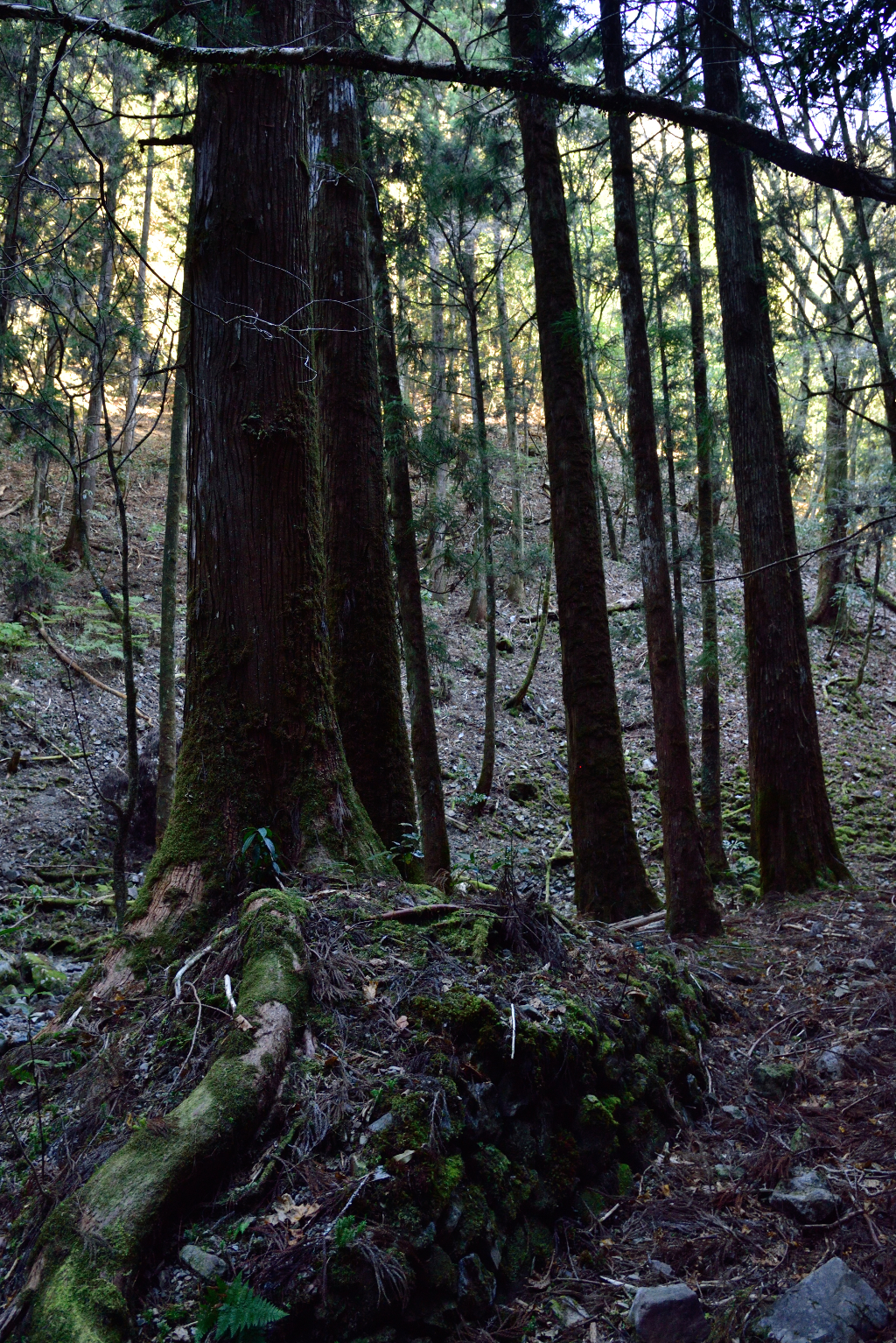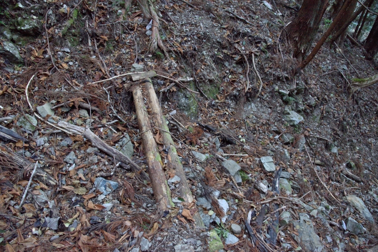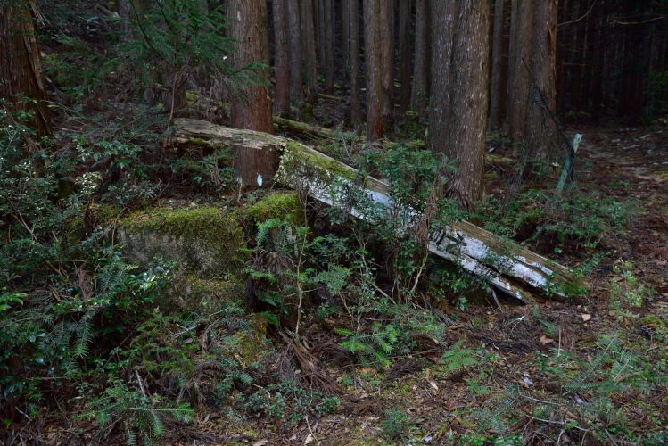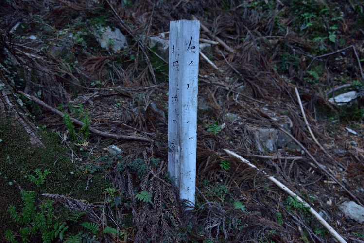 日もほとんど落ちてしまい、高い木々に囲まれた道まで届く光はもうありません。 向かって右手に、石垣に囲まれた屋敷跡?が見えました。 現地では、梅木平集落かと思いましたが、 『村影弥太郎の集落紀行』さまの『北ノ川(熊野川町)』にある、「寺院跡」(永詠寺)のようです。 2013年2月には残っていた小屋が、2024年には崩壊しています。 この小屋が、もしかしたら道標にあった「木原造林小屋」なのかもしれません。 梅木平集落を見逃がしたことになりますが、「保安林」看板以降、脇目も振らず歩いてきたので仕方なし… |