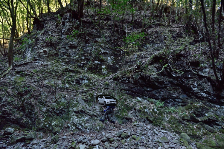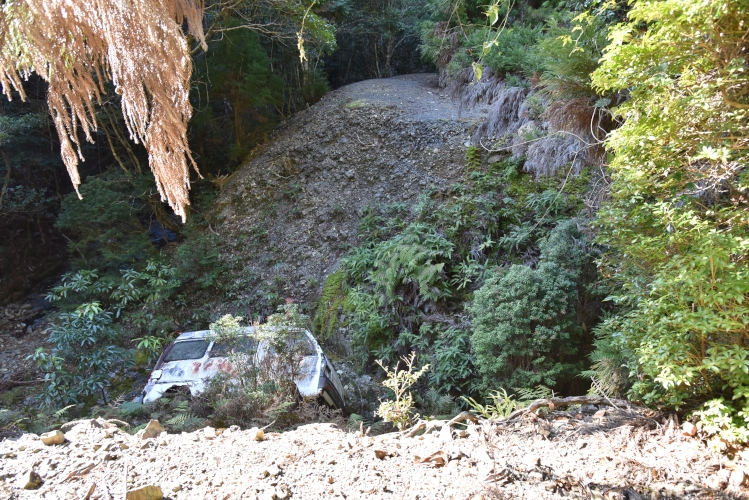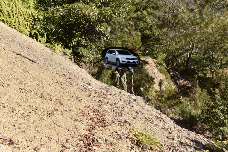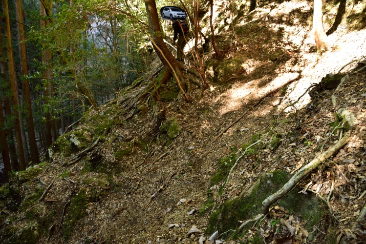この大規模な路盤消失区間、素直に車まで降り、向こうまで登り詰めてもよいですが…。 |