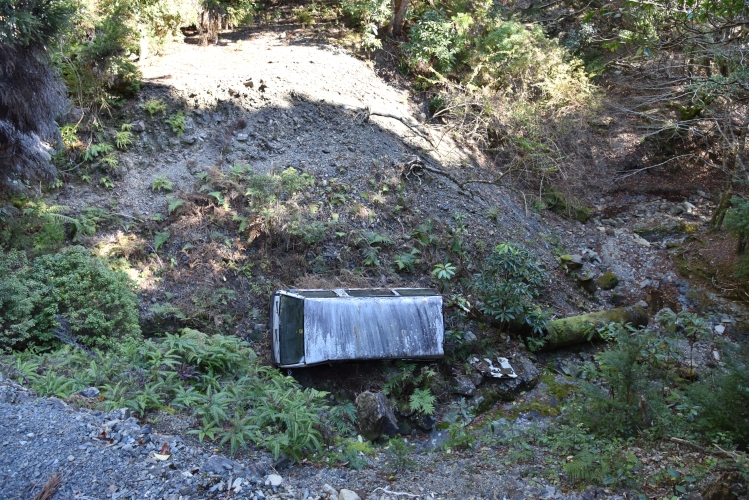 ここ、2つ目の明り区間から深山幽谷へと至る関所たる区間です。 崩壊した路肩をH形鋼らしきもので補強している箇所の手前にある深い轍にはまってしまい、空転して車では進めません。 2019年当時は突破できましたが、年々奥地へ至る困難は増えつつあります。 |