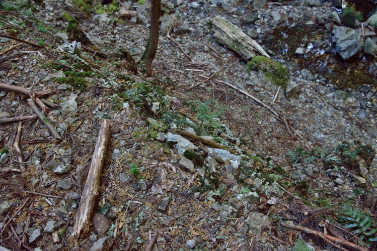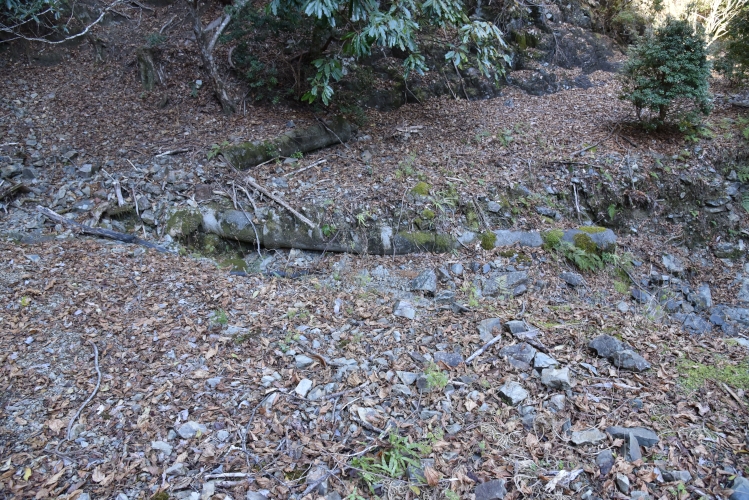 残置ロープの近くには、小規模ながら石垣があります。 ただ、この延長の橋梁を架けるには足りないため、 ほとんどが消失しているようです。 |