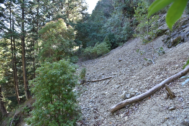 車道改修以前はこの道だったとばかりに、谷の上流側に道筋が見えるため、苦労することなく突破できました。 |