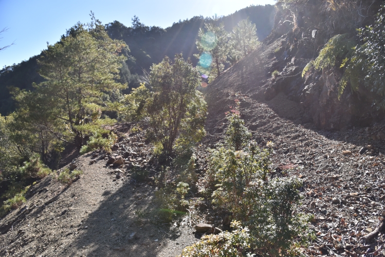法面崩壊区間を渡っていると、対岸に先程まで歩いていた区間が見えます。 写真でも明らかに勾配を上げる道筋が確認できます。 |