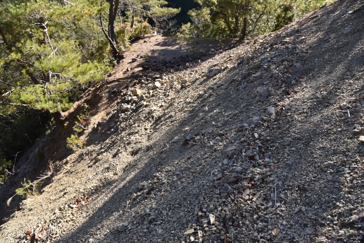 プチ崩落を越えた先に、道が続いているような、ないような… |