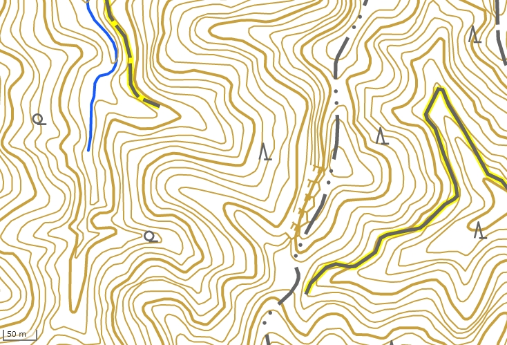 ここで、かつて小原川橋と中平集落を確認した際のログを見ると、 地形図にある道表記よりも西側に軌跡があります。 そう言えば、GPSだけを頼って小原橋を探したとき、なかなか見つからなかった記憶が… 過去の軌跡を頼りに暗闇を進むと… |