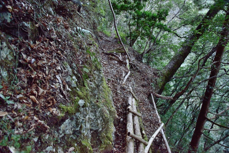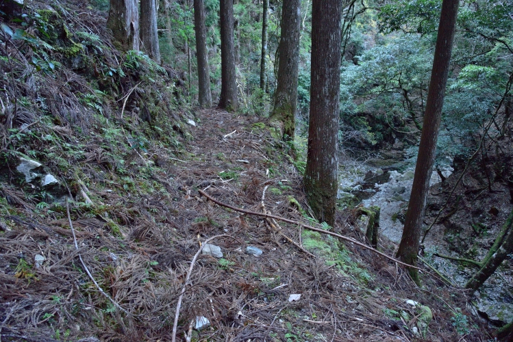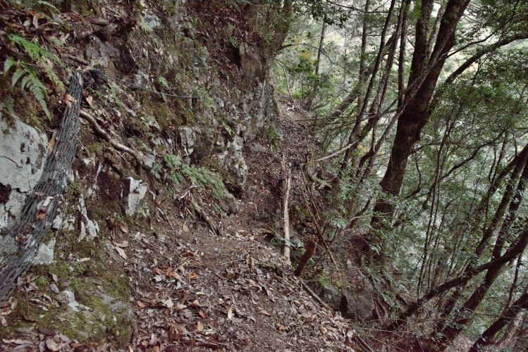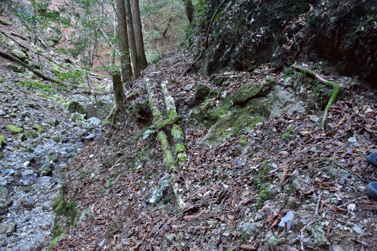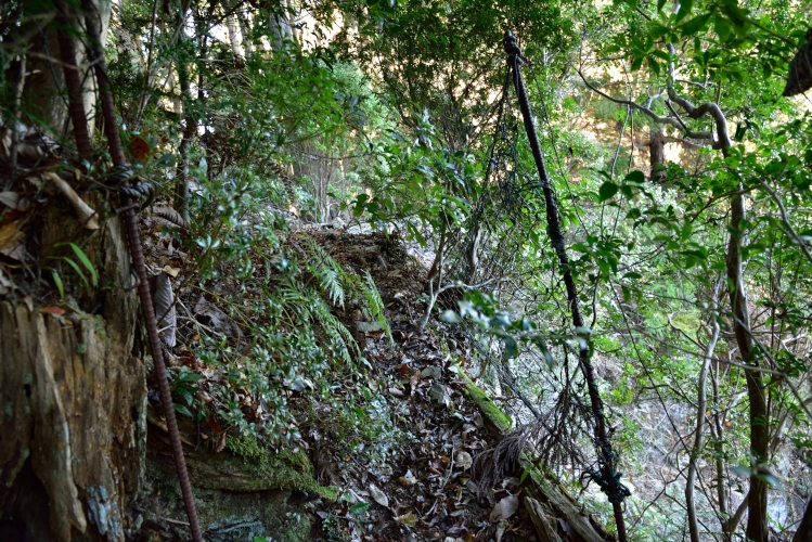 ここは路盤が完全に流出しており、ロープのサポートなしでは恐いところです。 |