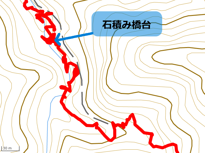 GPSで確認する地図には、もう少し南に道はあるようですが、測位ズレと判断しました。 橋台らしき石垣も見えます。 |