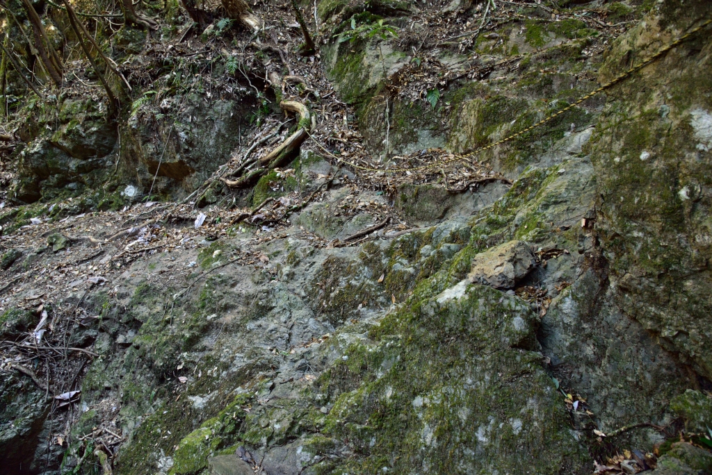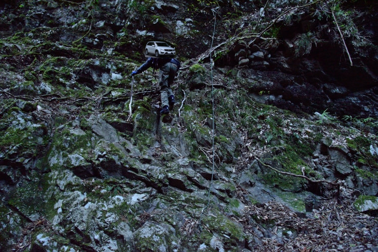 対岸は取り付く島が無さそうに見え、足掛かりとなる岩のほか、 結び目も完備のロープもありました。 少しばかりサポートしてもらい、登っていきます。 |