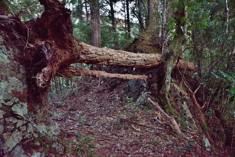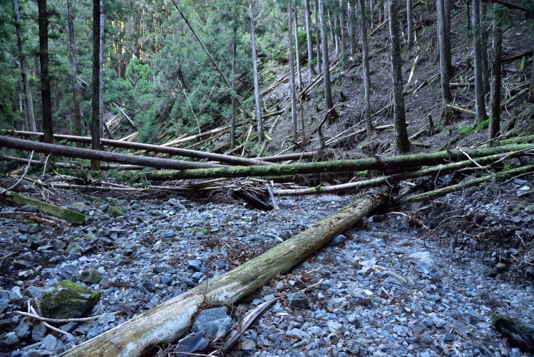 このあたりは倒木流木が多いです。 苔生したり濡れていたりし、変に足を掛けると滑ってしまいます。 |