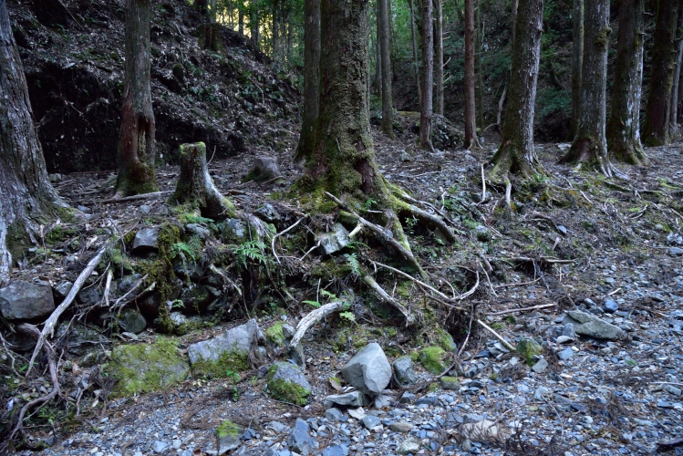 屋敷か農地跡らしき石垣が、あちらこちらにあります。 『村影弥太郎の集落紀行』さまの『北ノ川(熊野川町)』にある『モチノキ』集落跡ではなかと思います。 レポートによると、北ノ川集落では最大の宅地数(4軒)だったようで、ここが中心地だったのかもしれません。 |