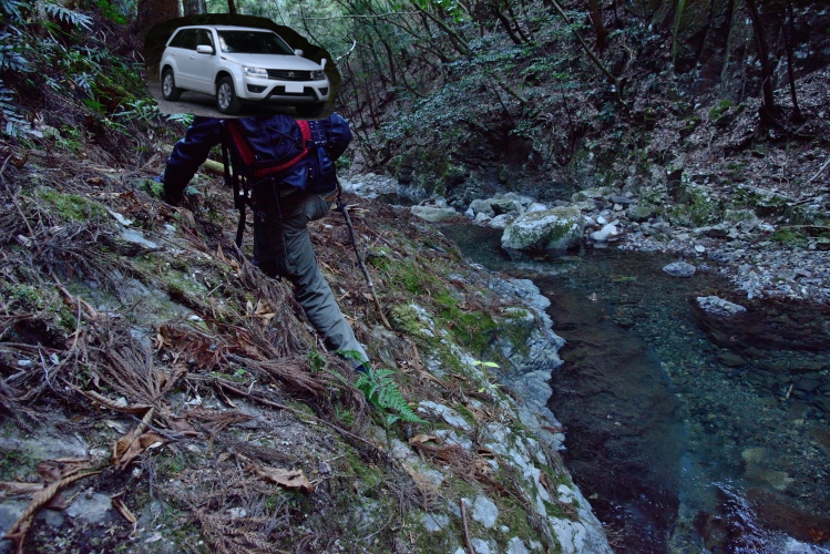 …万事休す。これは本当によくない状況です。 見た目は何ということはない、なだらかな地形ですが、ここぞいう場所に手掛かりも少なく、土質も柔らかで、 この先、真っ直ぐ進むことも、山手へエスケープすることもできなくなりました。 河床に降りても、対岸の切り立った岩肌をよじ登ることもできそうになく、 今来た道を戻っていては、確実に日没を迎えます。 |