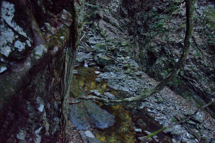 涸れている和田川支流が見えてきました。 行く手には3パターンほど道が見えますが、進むべきはどこか… そもそも、本来の道はもっと山手にあるのか… 元から日の光が入らない谷沿いで、日没も迫る中、とりあえず前に進むしかありません。 |