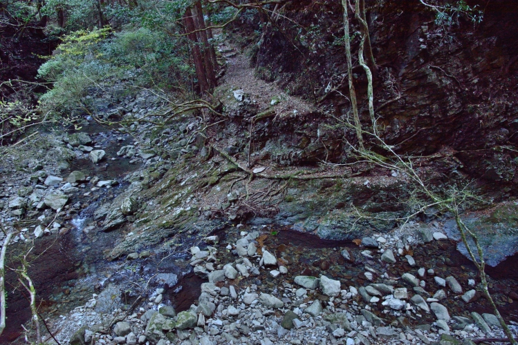 もうこの道の完全走破は諦めて、対岸にエスケープするしかありません。 河床に降りたとして、どこから登ることができるか、と下流方面を見ますが、こちらは無理そうです。 |