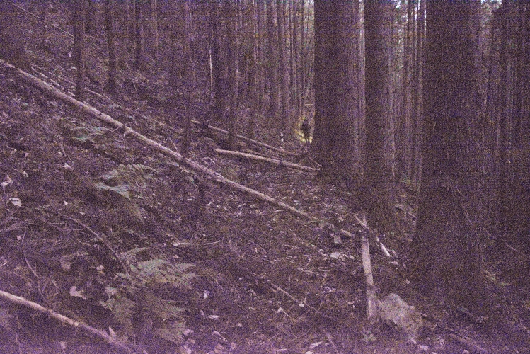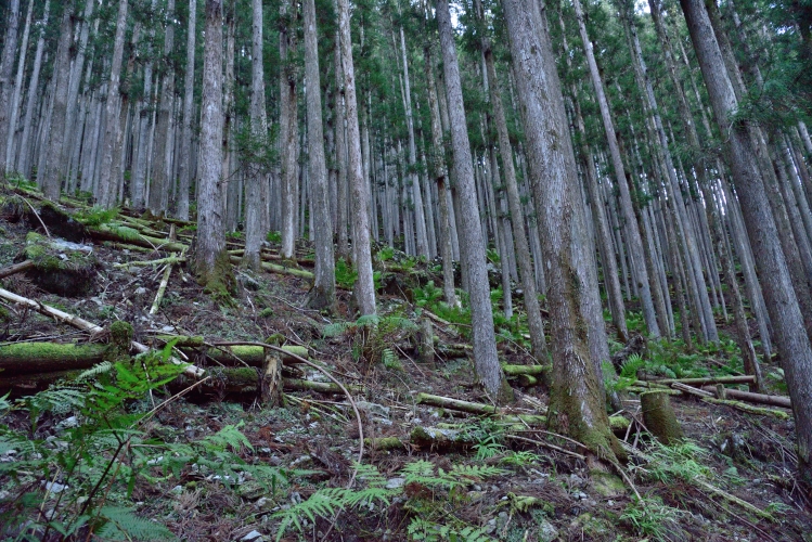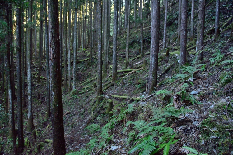 車道の続きはないかと奥を覗き込みますが… 作業道はおろか、人の手が入った気配もありません。 |