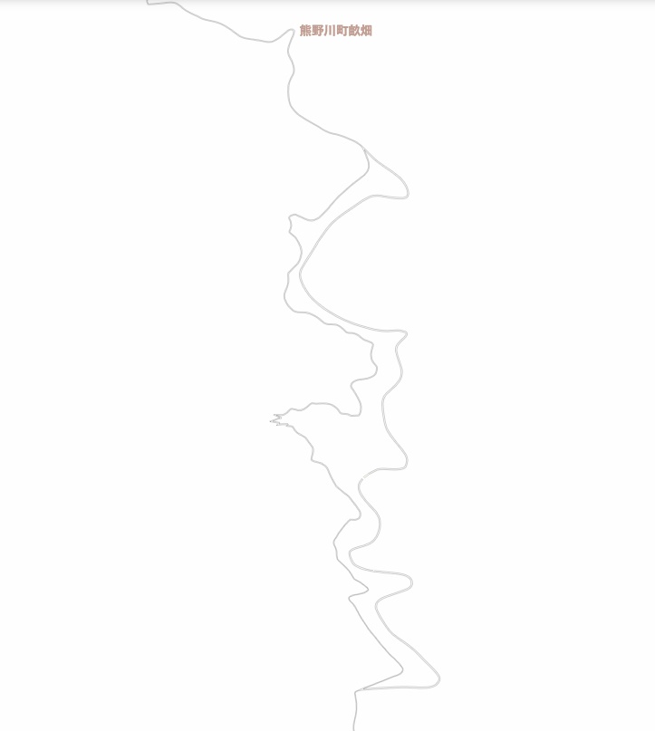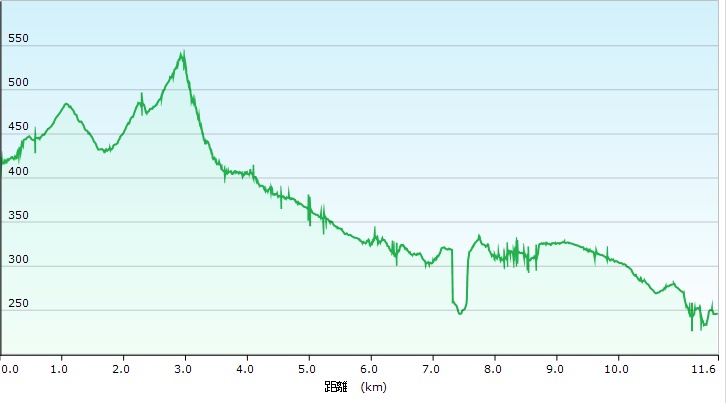 徒歩走行距離は、約11.6km、 徒歩走行時間は、約6時間40分、 標高の最高地点は那智勝浦町と熊野川町の境で約540m、 最小地点は(橋直前で道を見失った際の記録を除き)ゴール地点の約246mでした。 勾配がきついものの、路面が安定している那智勝浦町側の車道区間、 序盤は河床も歩くことができ、路面も比較的安定しているものの、 谷沿い区間を境にさながらアスレチックコースと化す熊野川町側の徒歩道区間…と変化に富んだ道路でした。 |