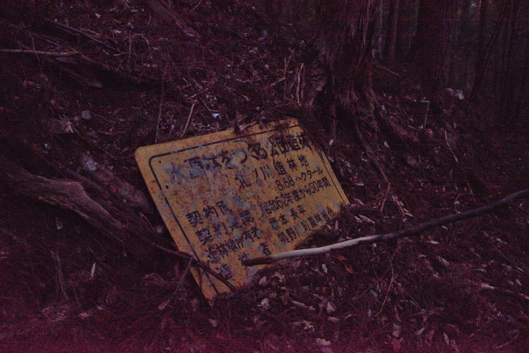 水源林をつくる公団造林 北ノ川造林地 契約面積 8.68ヘクタール 契約期間 昭和62年度から50年間 造林地所有者 榎本長平 造林者 熊野川町森林組合 今までは道標の昭和47年が、通行があったであろう最終年でしたが、 造林事業のため、昭和62年前後にも人の出入りはあったようです。 ちなみに、昭和62年度から50年後は1987+50=2037年です。 2037年に向け、またこの道が整備されることがある!…のかもしれません。 |